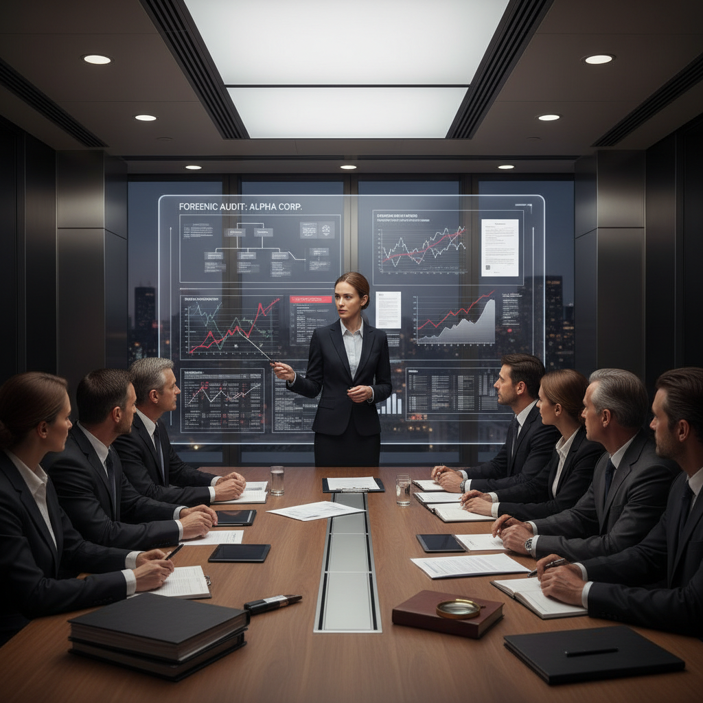 Accounting professional presenting forensic findings in a tense boardroom, highlighting their pivotal role in fraud detection and governance.
