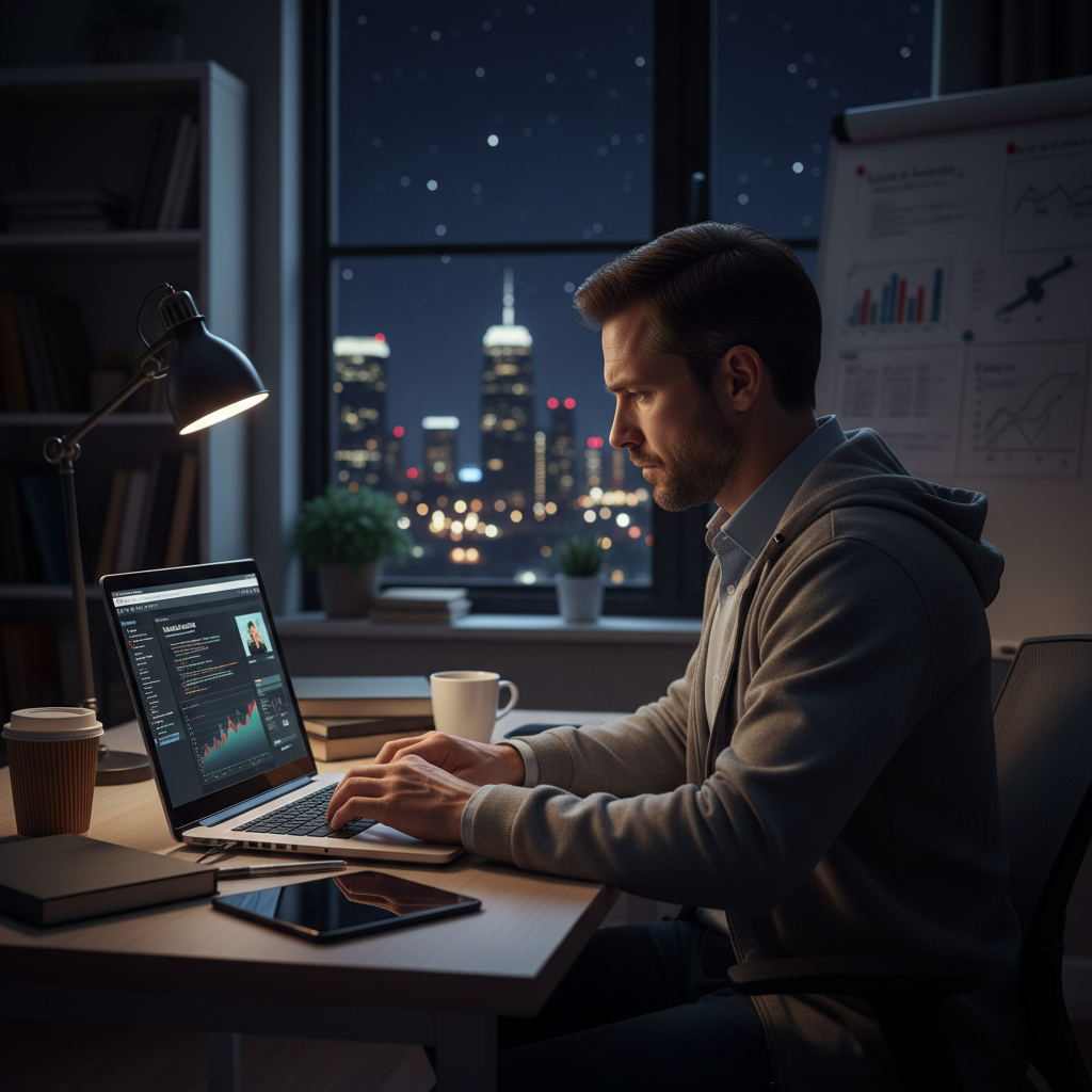 Solo accounting professional upskilling online late at night, symbolizing the commitment to ongoing education and mastery.