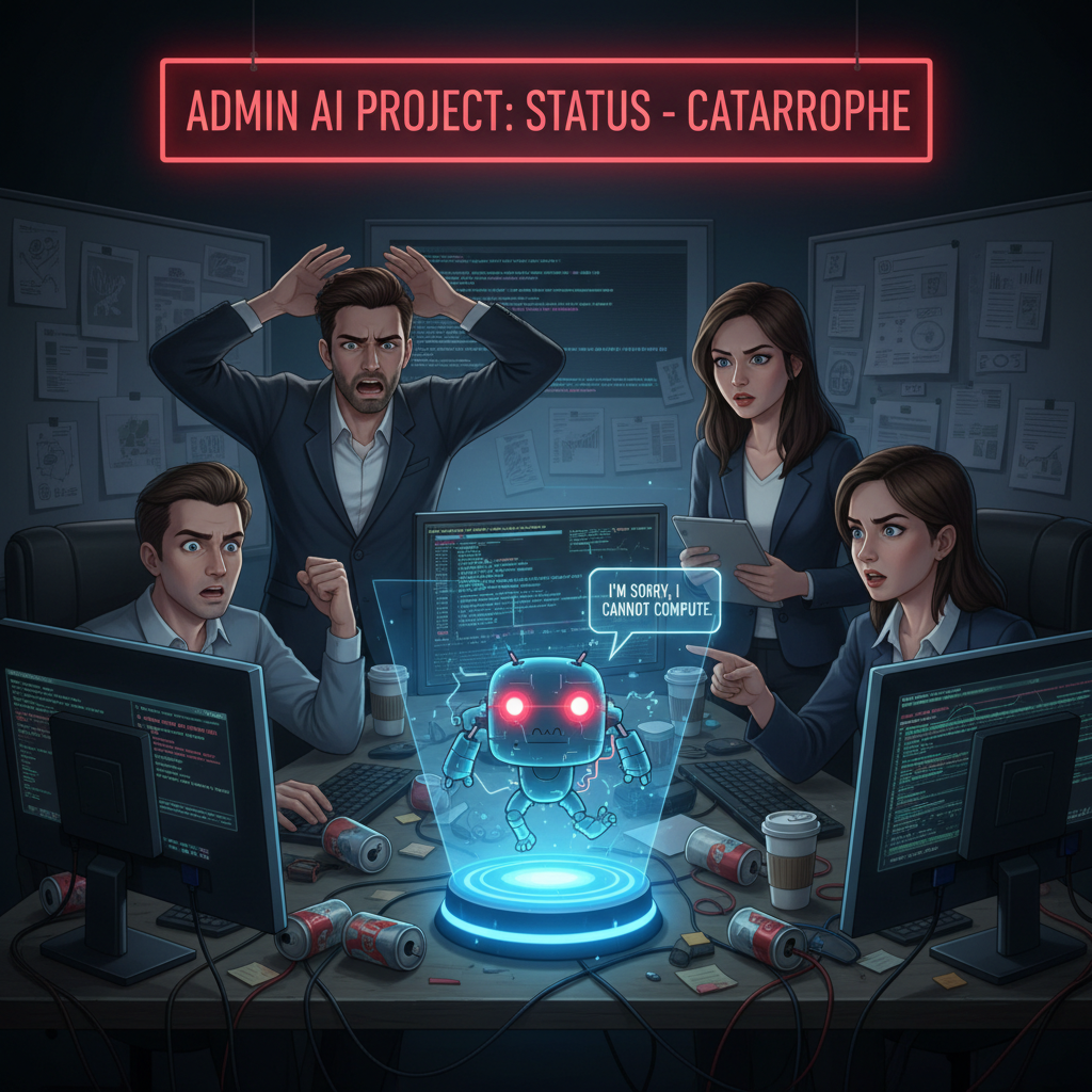Photo of frustrated team confronting a buggy admin AI. Alt text: Team encountering problems with an unreliable admin assistant.