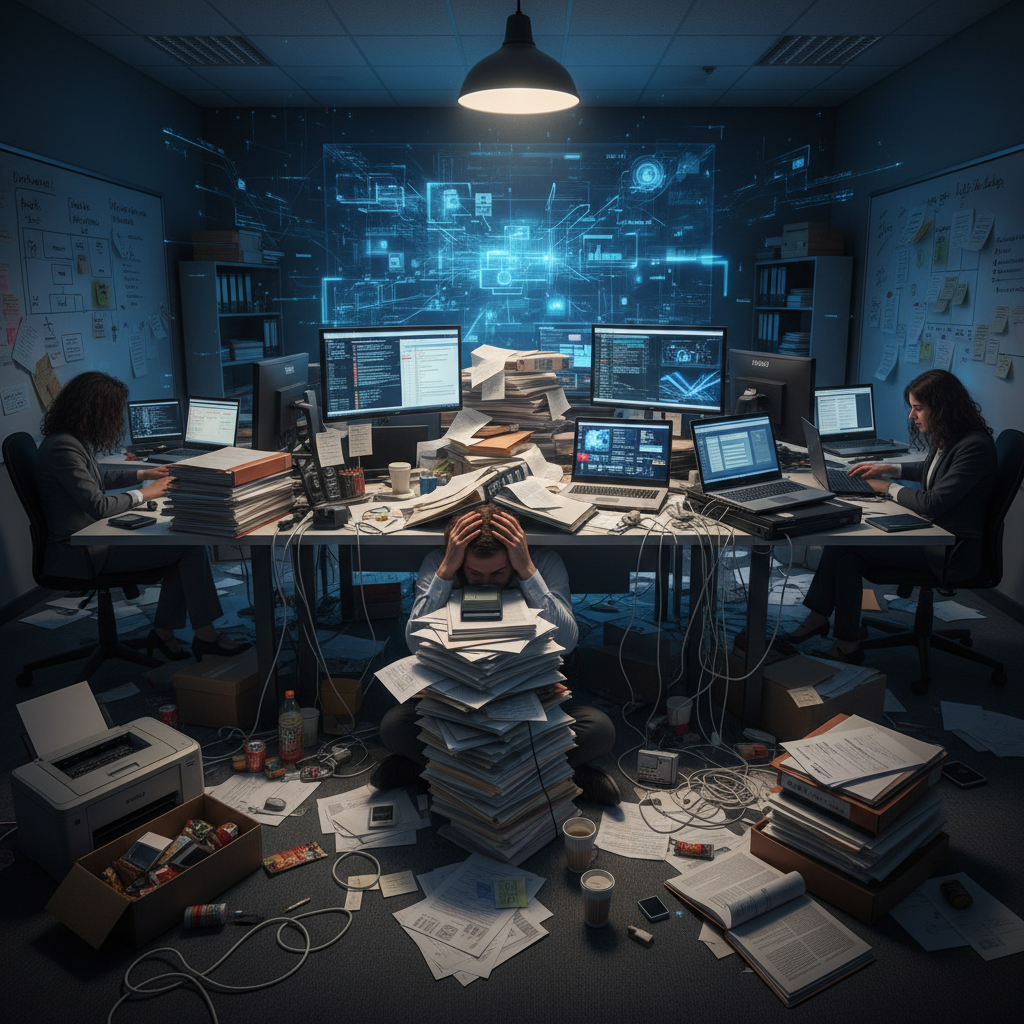 Alt: Office overwhelmed with chaotic documents, highlighting digital document administration risks