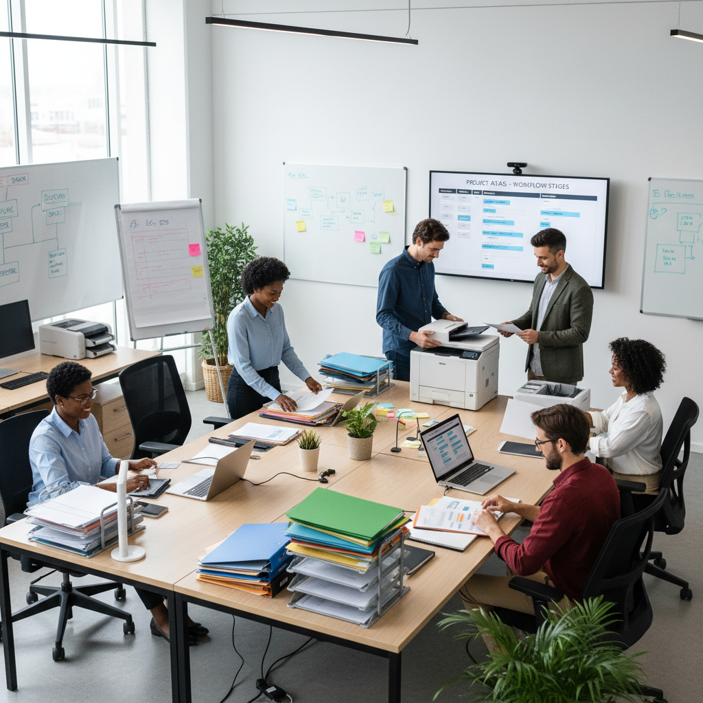 Alt text: Visual workflow for paperwork administration, showing a team navigating digital and manual steps efficiently.