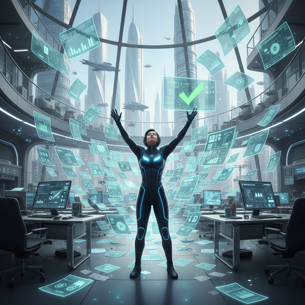 Alt text: Victorious worker celebrating paperwork mastery in a futuristic office, organized files symbolizing streamlined document management.