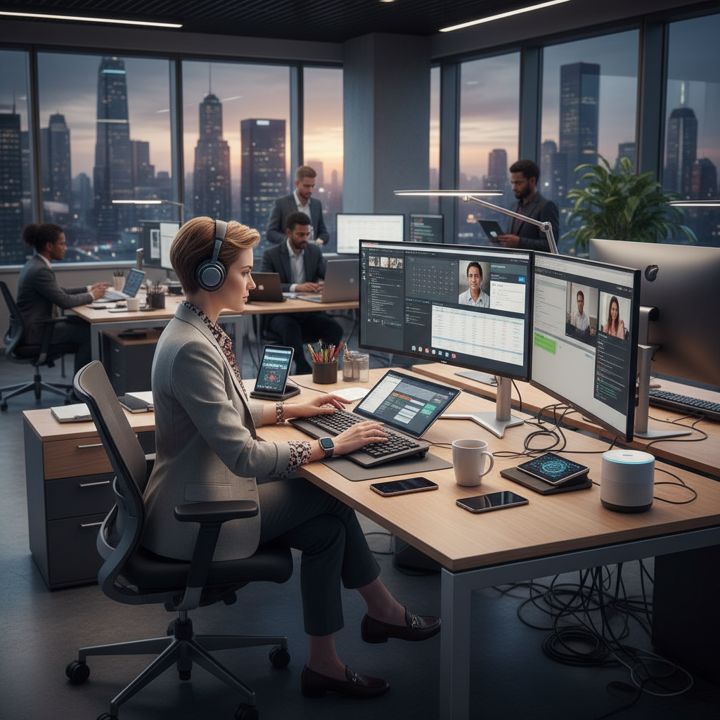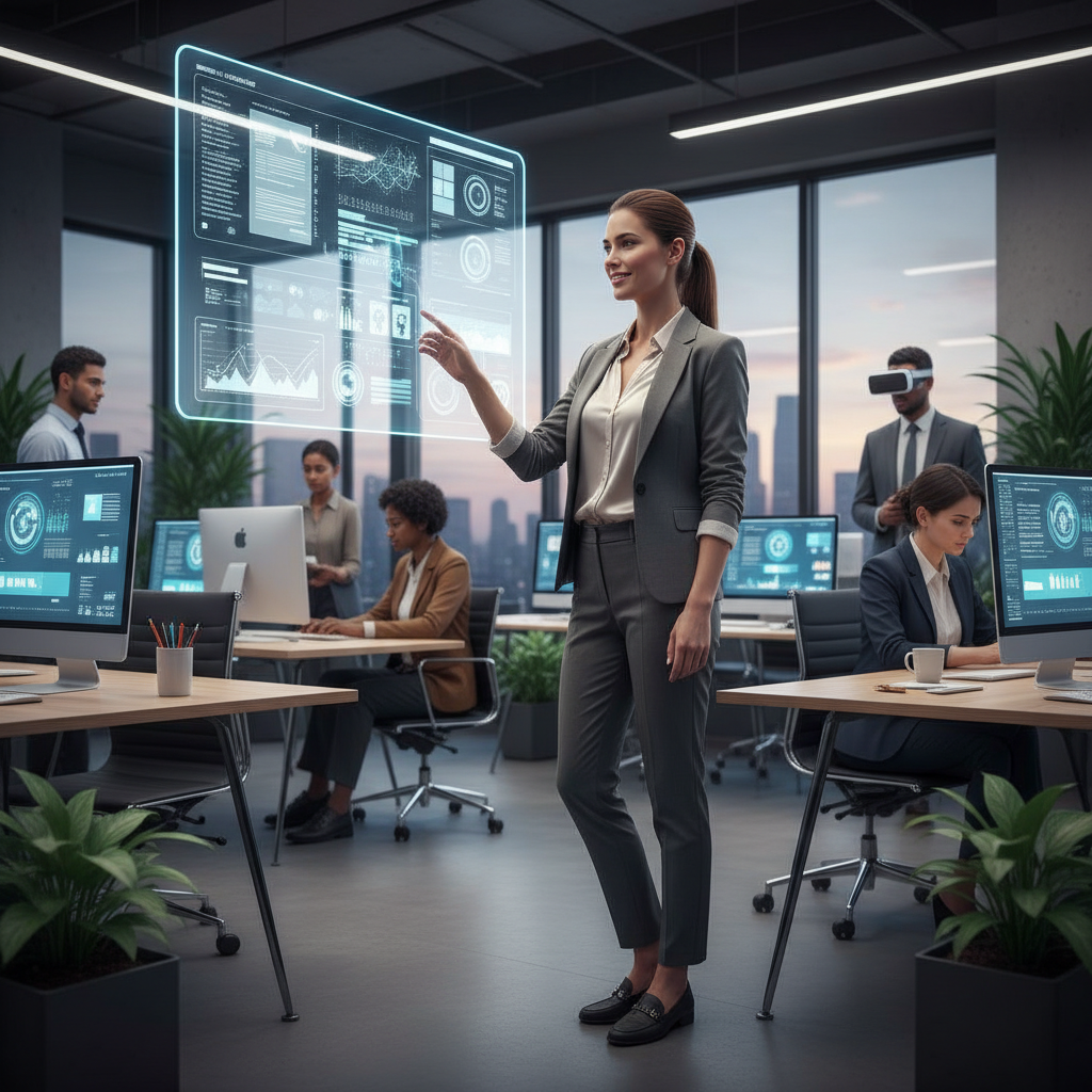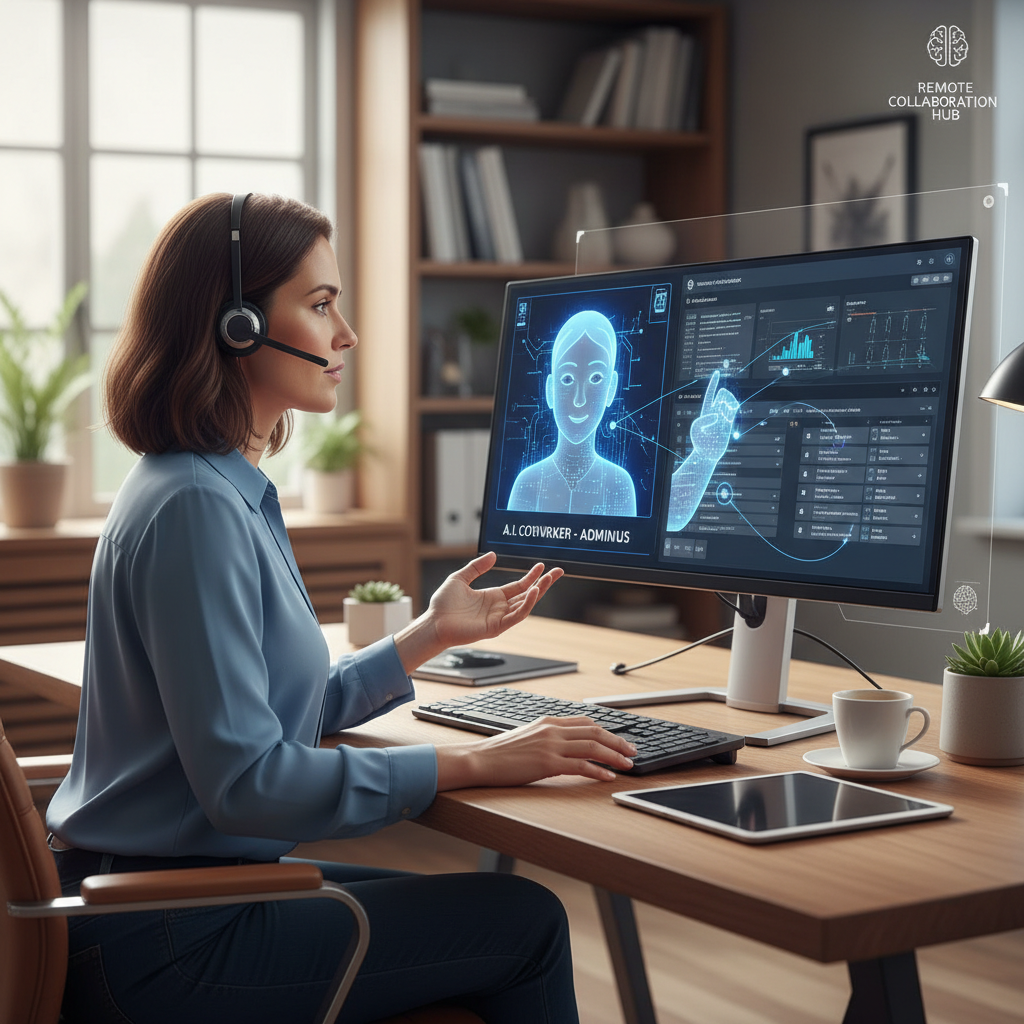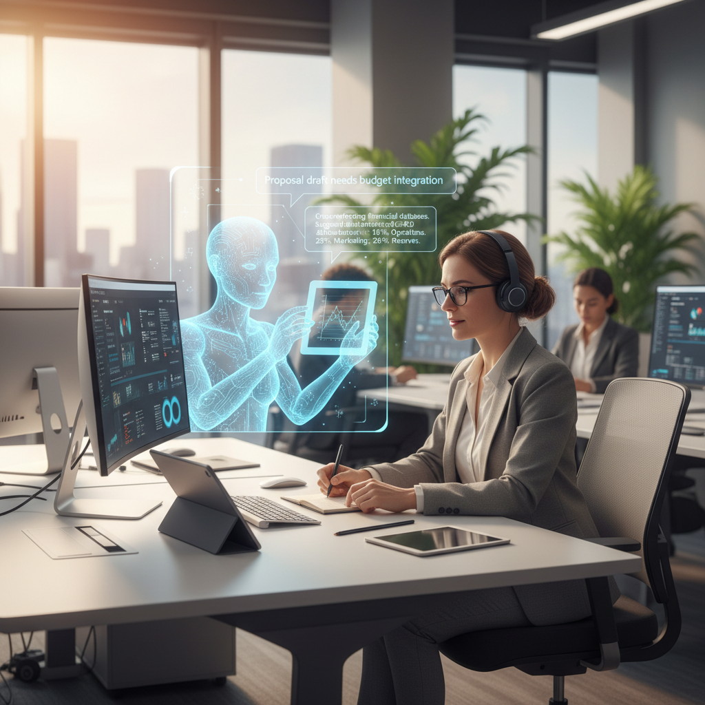 Alt text: Administrative aide collaborating with AI-driven digital tools, symbolizing future of office support