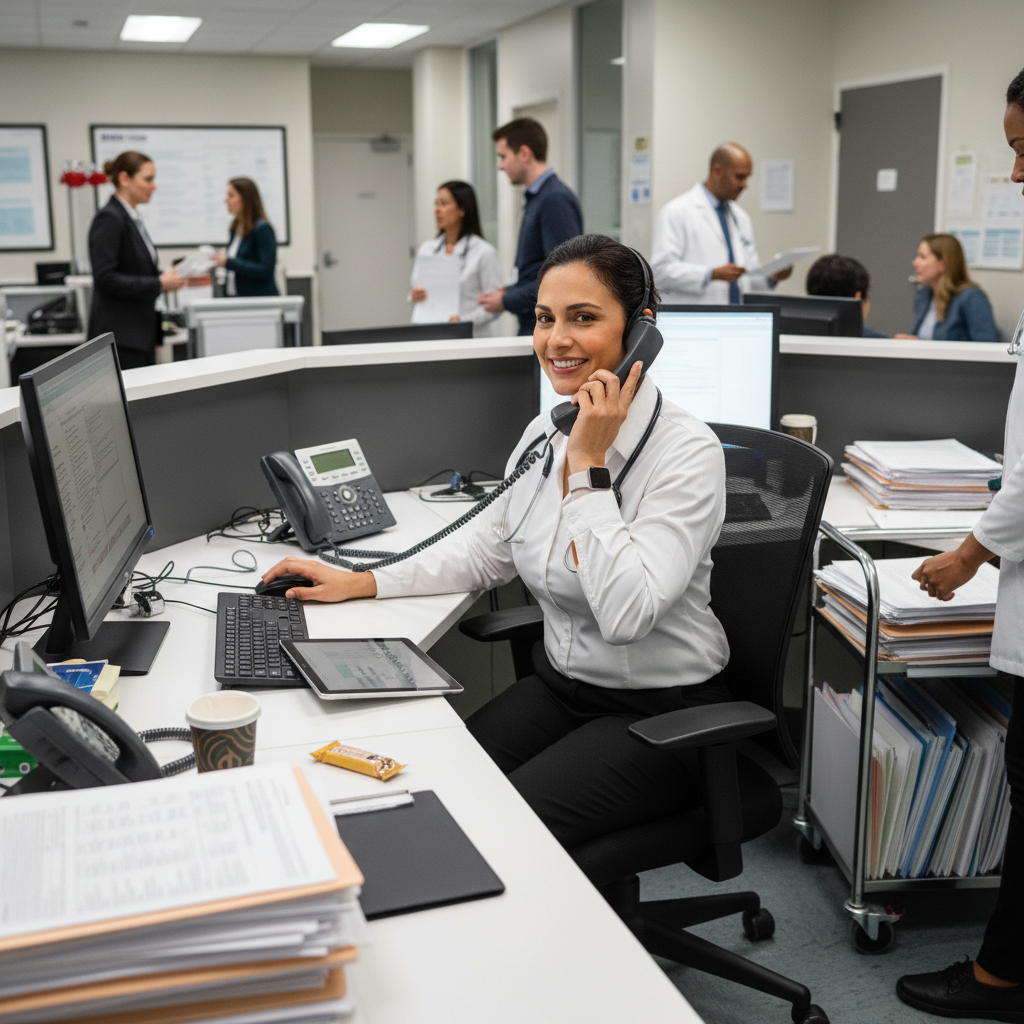 Alt text: Administrative aide multitasking in a healthcare office, surrounded by files and screens