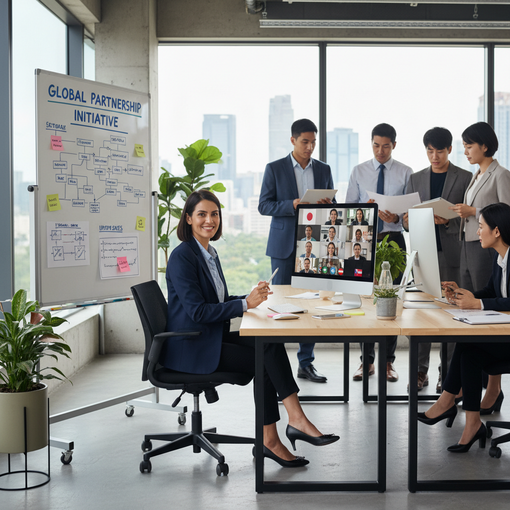 Alt text: Administrative aide coordinating with diverse international colleagues, representing global office culture
