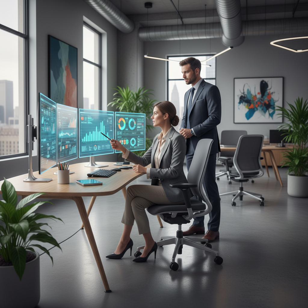 Alt text: Administrative aide analyzing digital trends in modern office, highlighting future opportunities and challenges