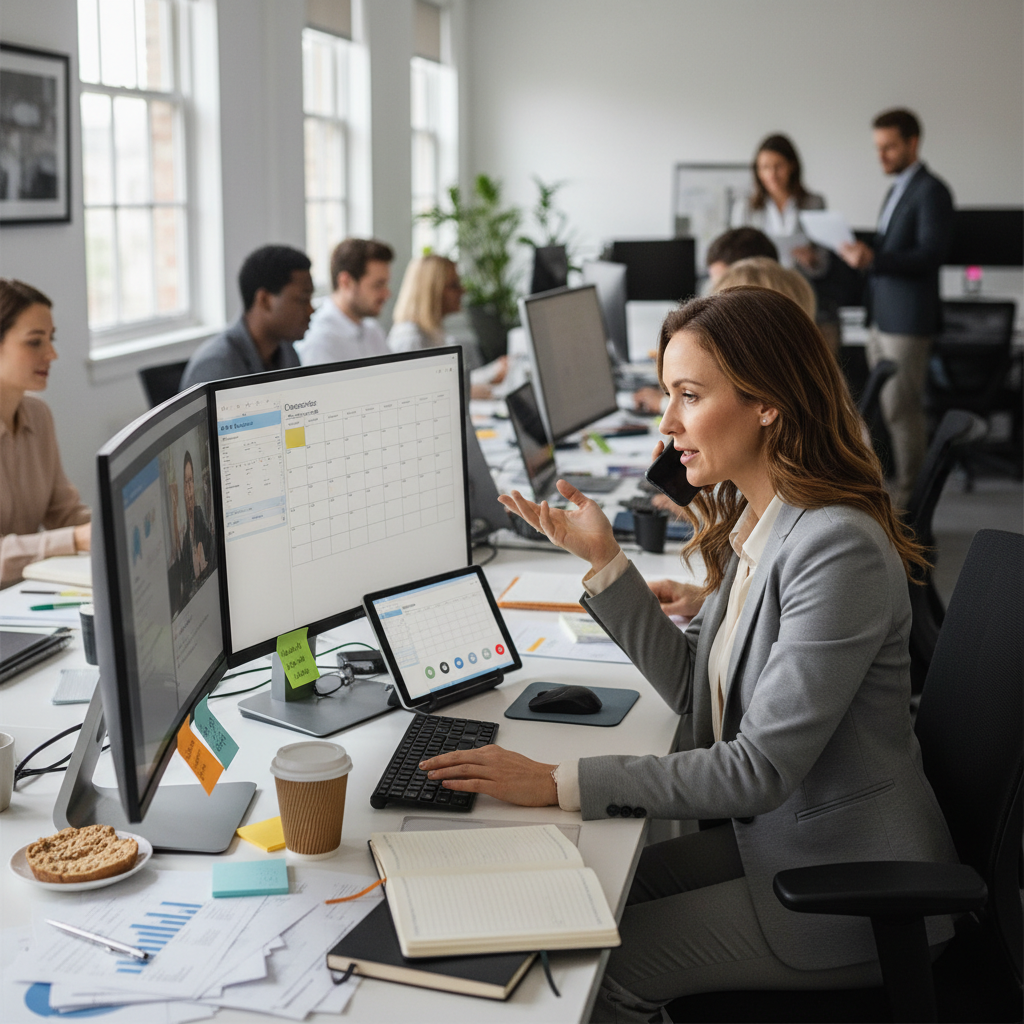 SEO-friendly alt text: Administrative manager handling multiple calls, emails, and digital tasks in a chaotic modern office.