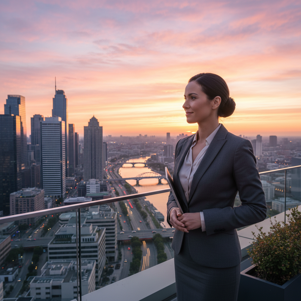 SEO-friendly alt text: Administrative manager gazing over city skyline at sunrise, symbolizing new beginnings and career success.