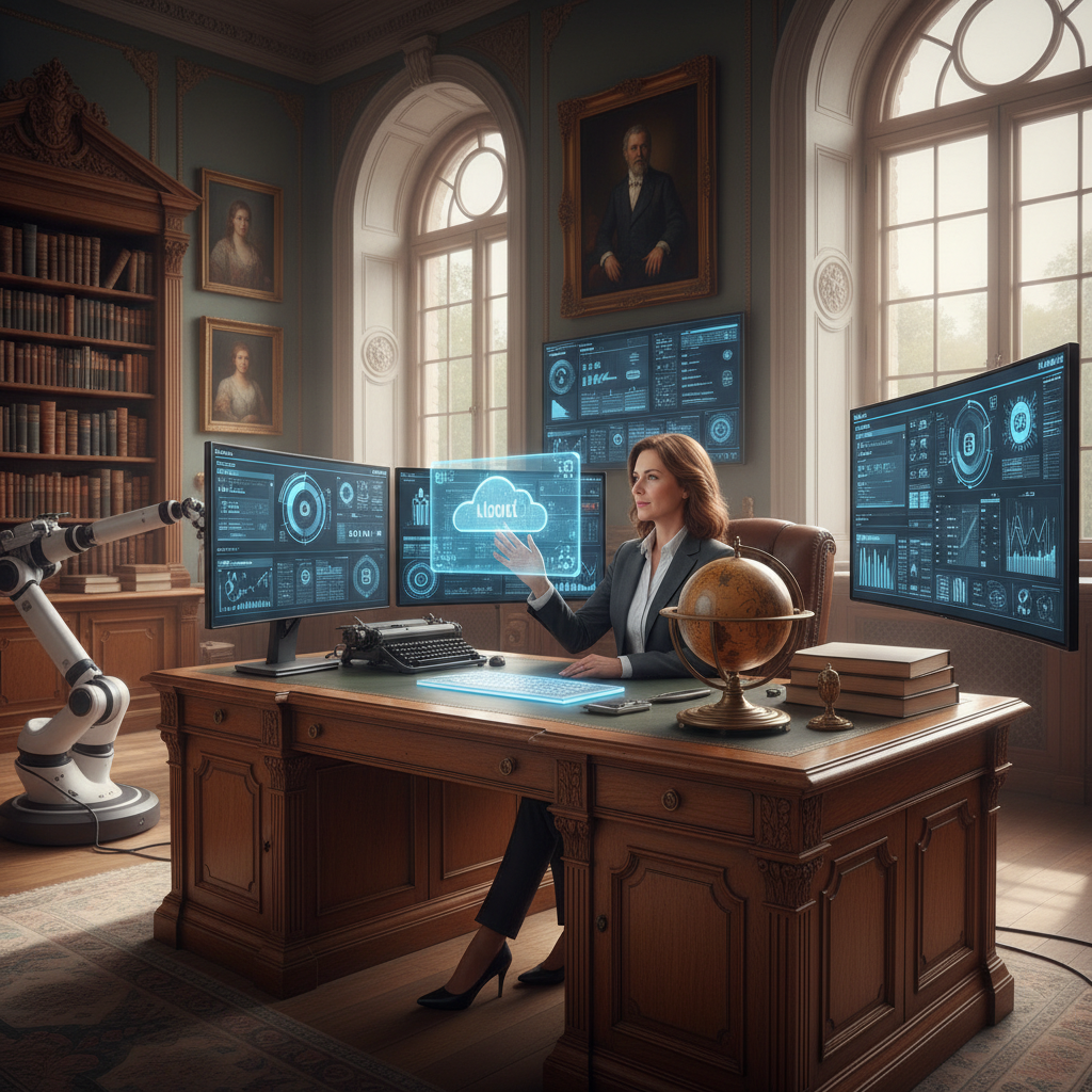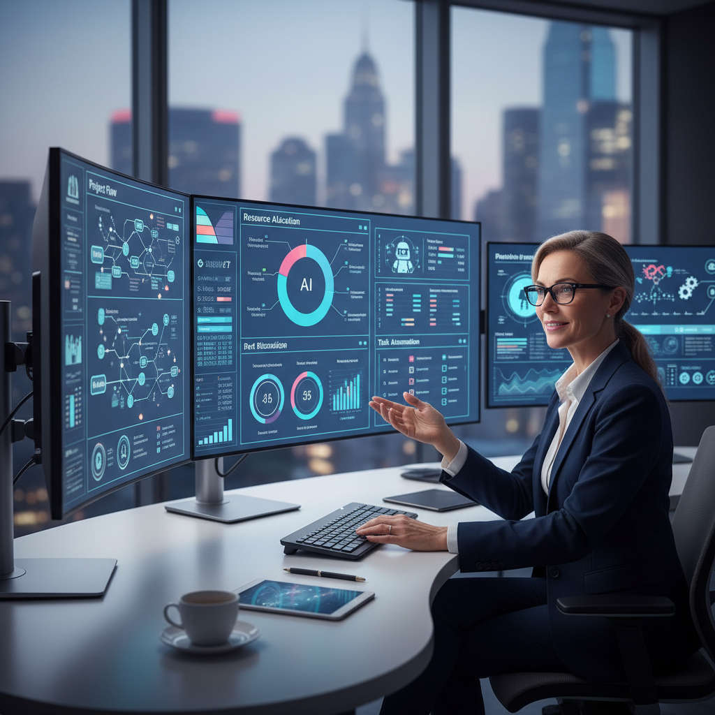 SEO-friendly alt text: Administrative manager using digital dashboard with AI-powered tools in a modern office, highlighting digital dexterity.