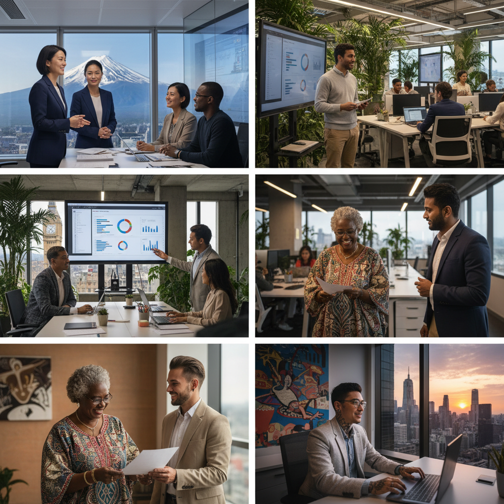 SEO-friendly alt text: Collage photo of administrative managers in international offices, representing global cultural diversity in admin management.