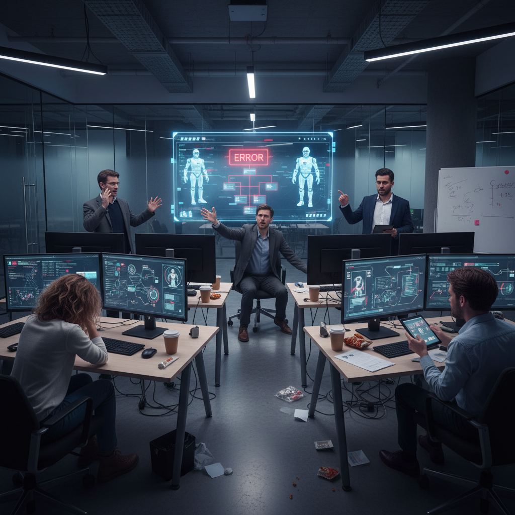 Alt text: Frustrated team trying to configure AI collaboration software in a modern office, highlighting setup challenges with AI collaboration platforms and digital teammates.