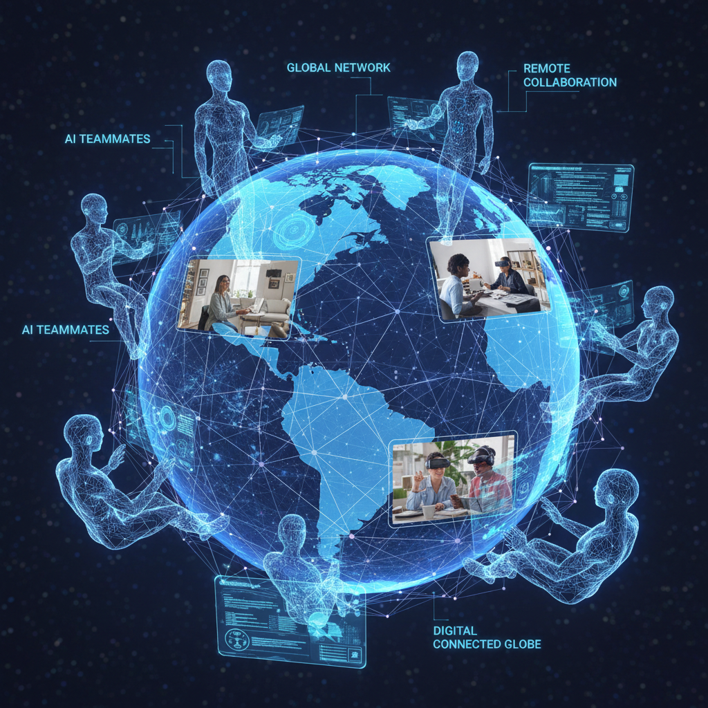 Alt text: Symbolic photo of a digitally connected globe with human and AI figures linked, representing global digital collaboration with AI teammates.
