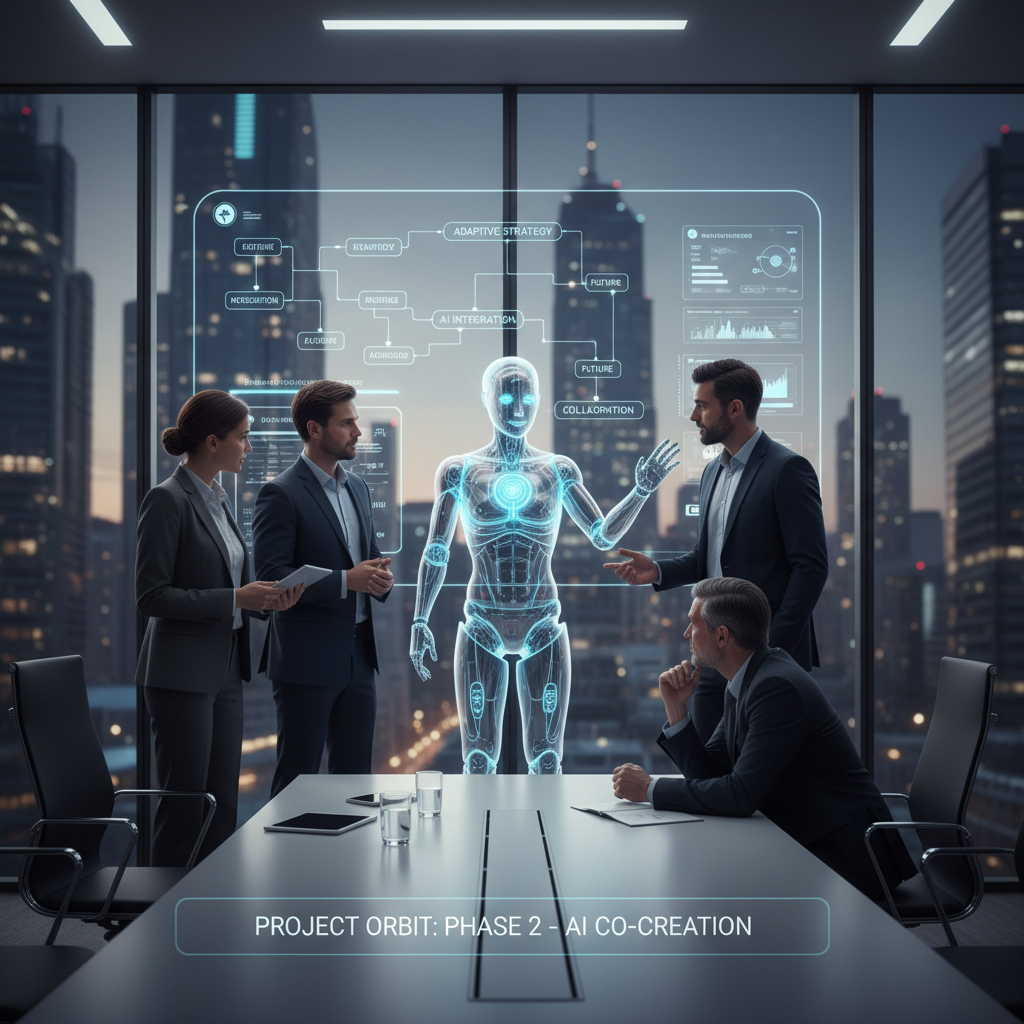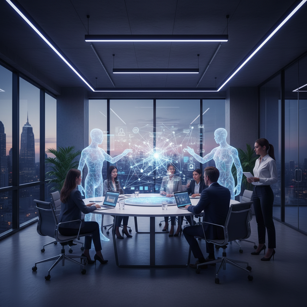 AI collaboration in a modern business office: Human and AI avatars brainstorming together, representing next-gen teamwork.
