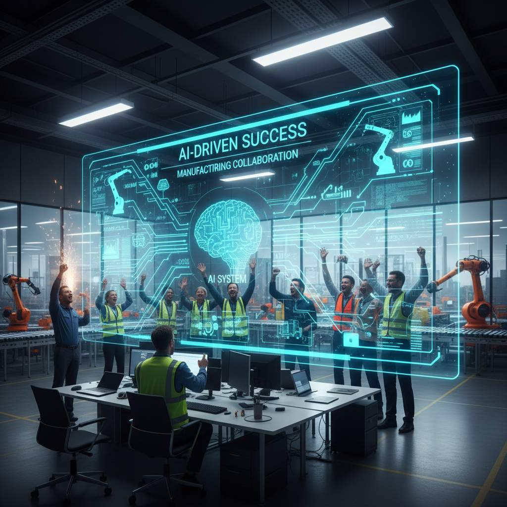 AI-driven success in manufacturing collaboration: Team celebrates breakthrough with AI-powered project management in action.