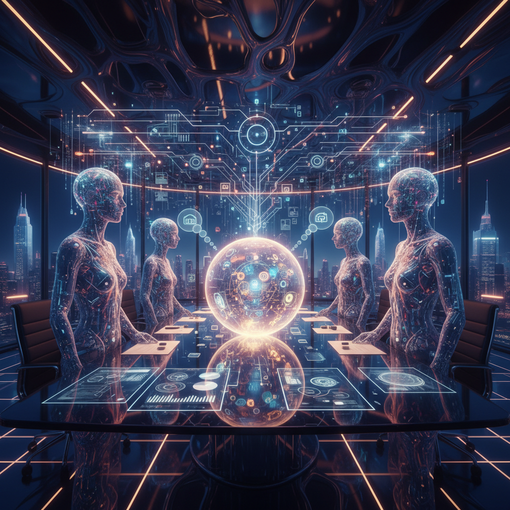 Future of AI collaboration in business: Human and AI figures merge ideas in a surreal, high-tech office.