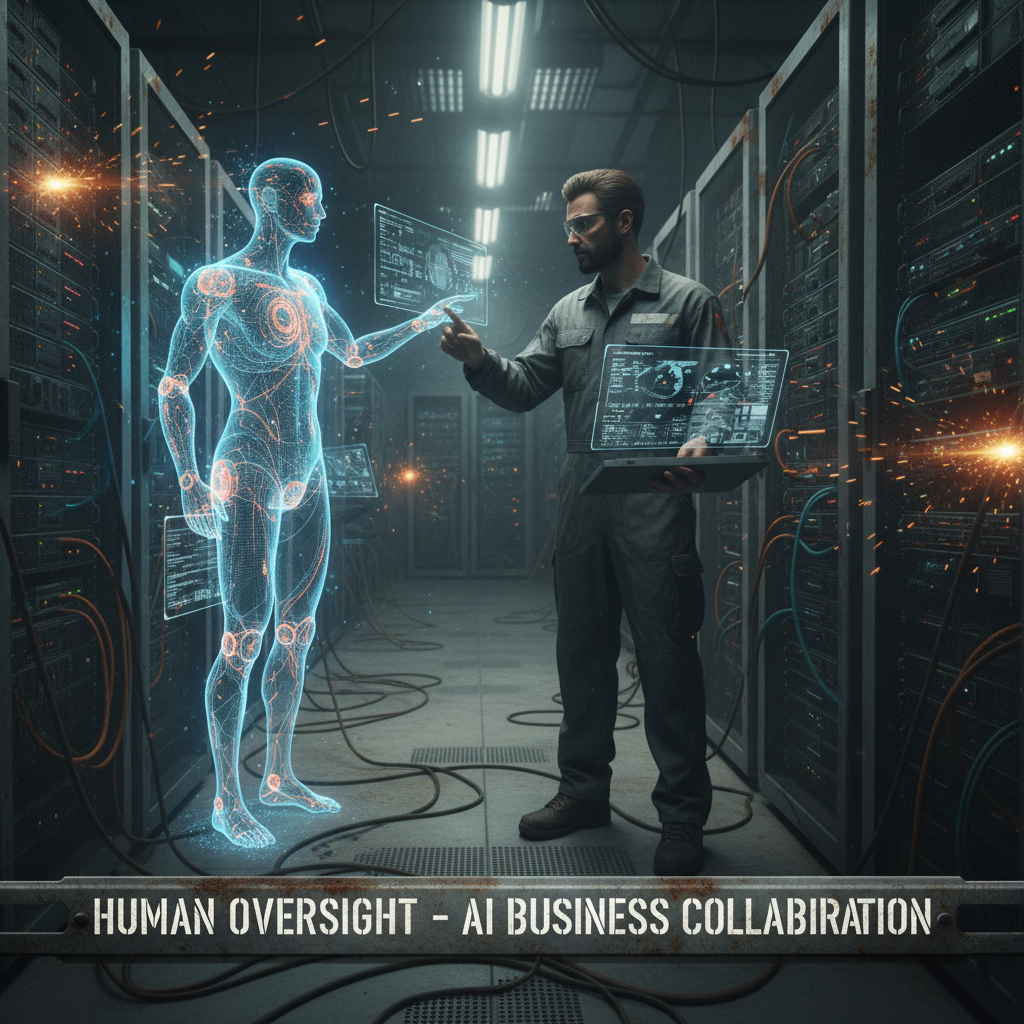 Human oversight remains essential for trustworthy AI collaboration: Technician monitors AI dashboards to keep business on track.