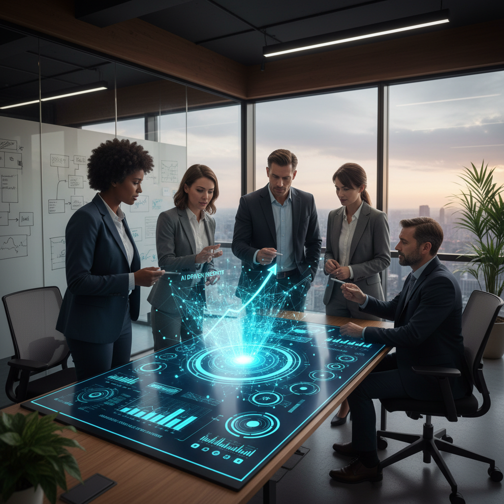 Alt text: Business team collaborating with an AI-powered dashboard, representing AI driven business management tools in action