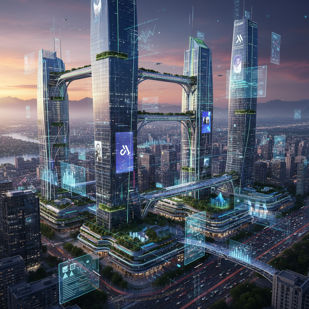 Alt text: Futuristic business district with AI data overlays representing next-generation AI driven business management tools