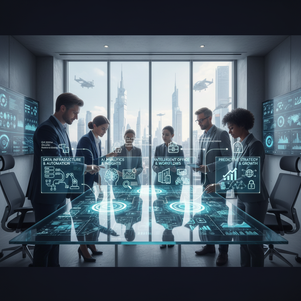 Alt text: Implementation roadmap for AI business management tools, showing people in an office planning deployment