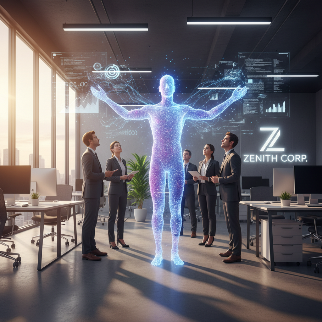 AI-driven enterprise management assistant visualized in a modern, collaborative office setting