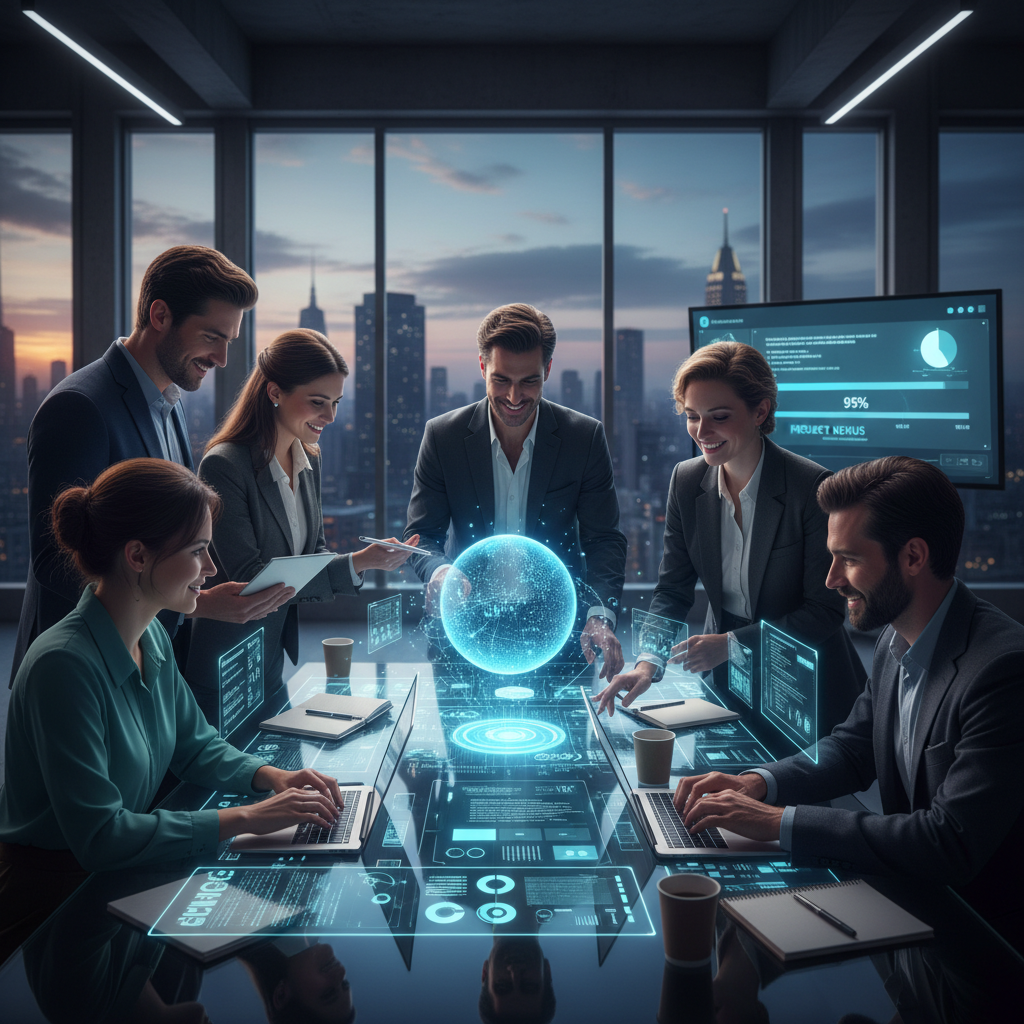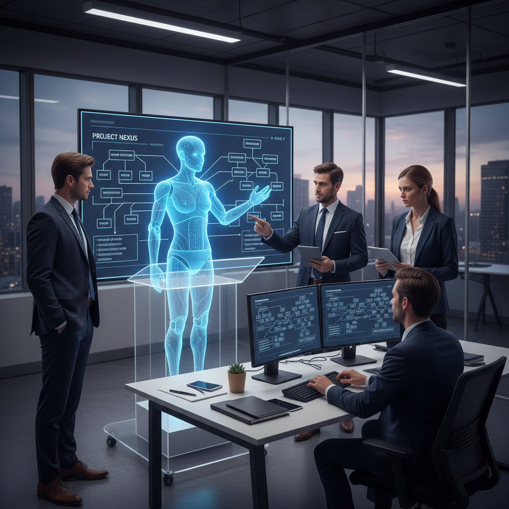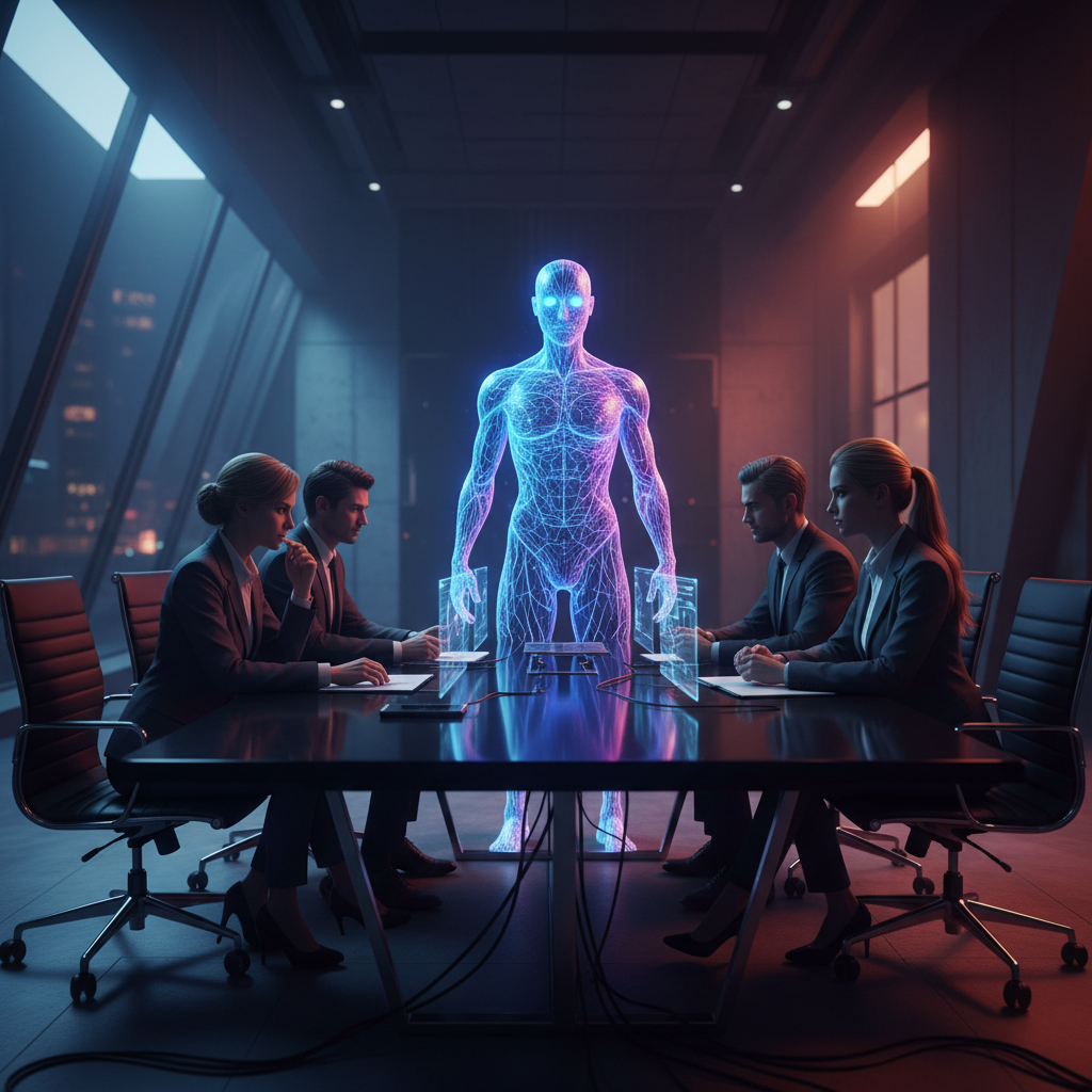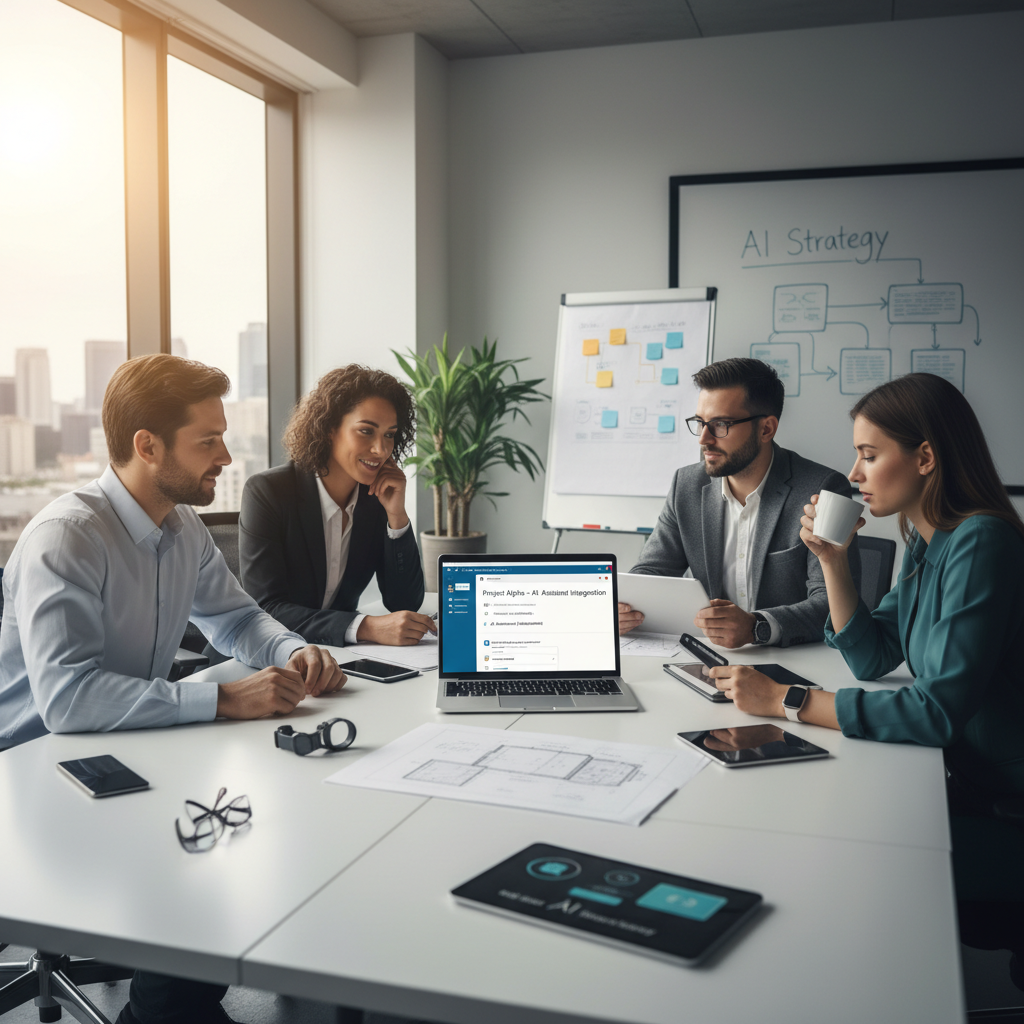 Photo: Business team at a modern conference table, AI enabled business assistant glowing among them, symbolizing the digital shift in enterprise collaboration.