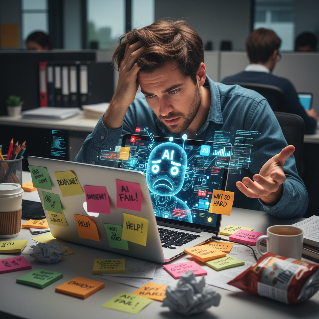 Photo: Frustrated employee overwhelmed by poorly integrated AI assistant, symbolizing the gap between marketing and real productivity.