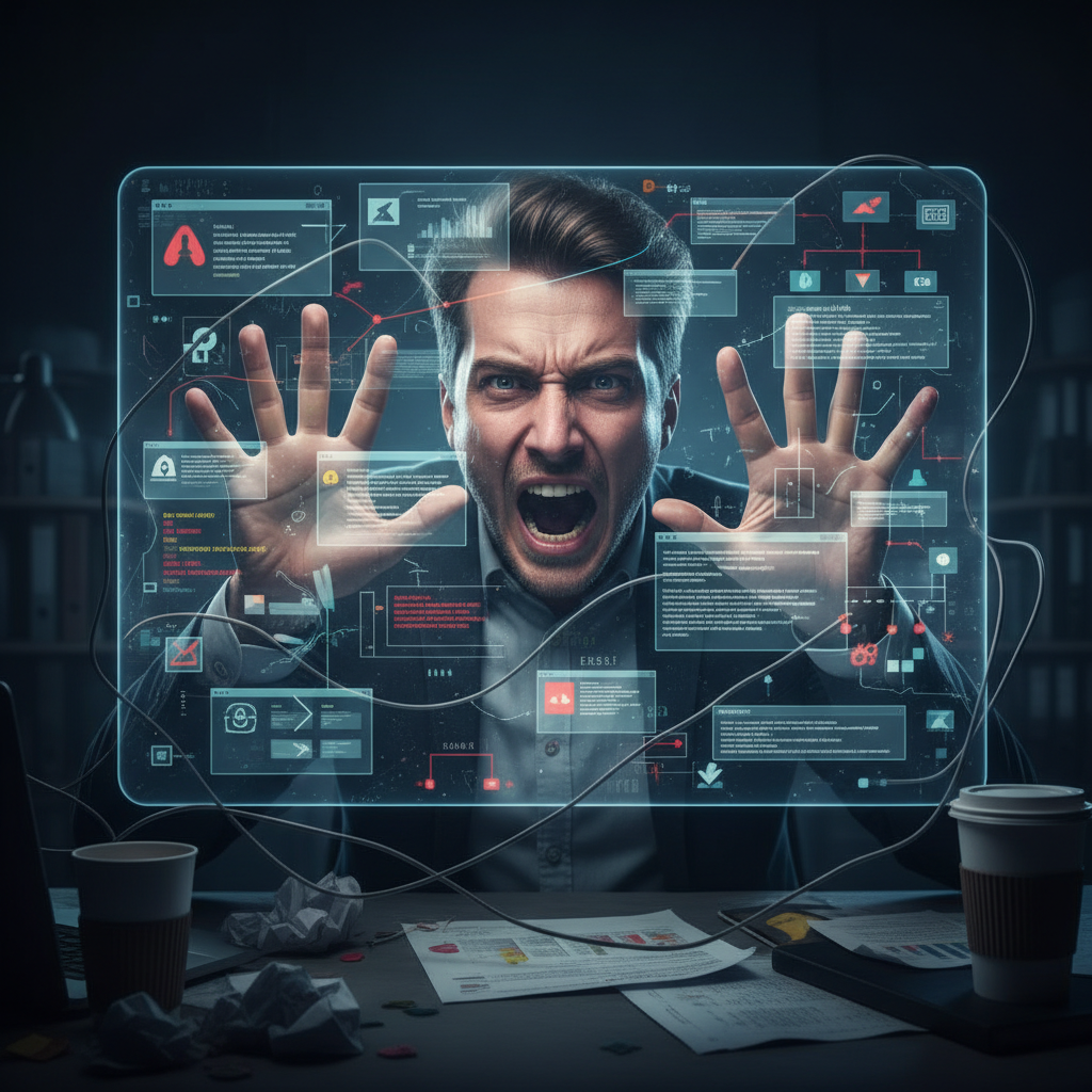 Employee struggling with new AI collaboration software, highlighting the all-too-common onboarding and adaptation challenges faced by real teams.