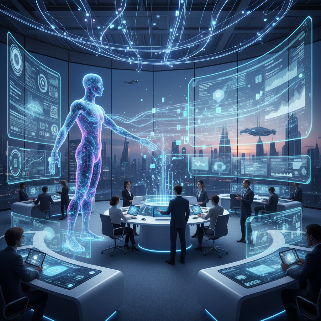 Humans and AI working together in enterprise collaboration, symbolizing the synergy and future of augmented teamwork.