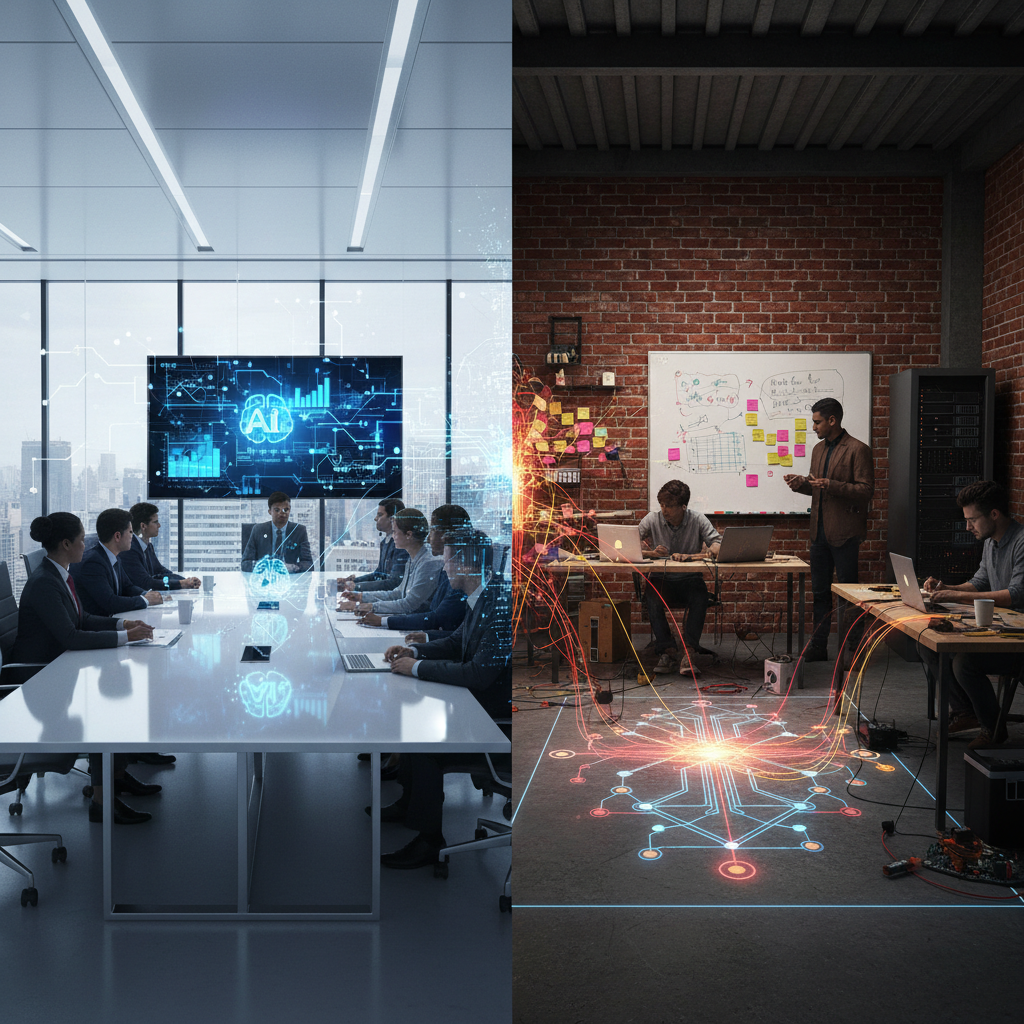 Contrasting enterprise and startup AI collaboration setups, illustrating the versatility and reach of AI-enabled teamwork across organizational sizes.
