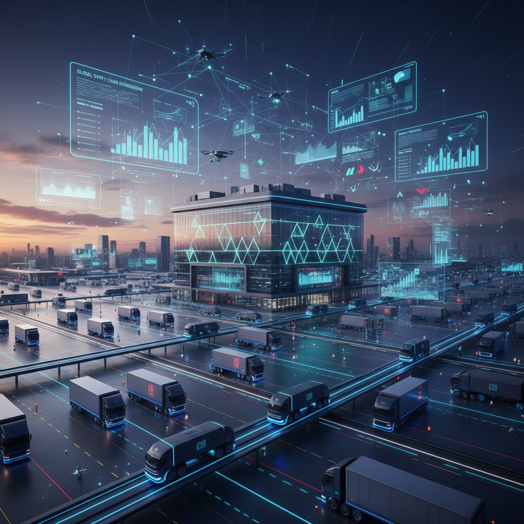 AI-driven logistics hub with trucks and data overlays, showcasing the impact of AI-enabled decision making on supply chain efficiency.