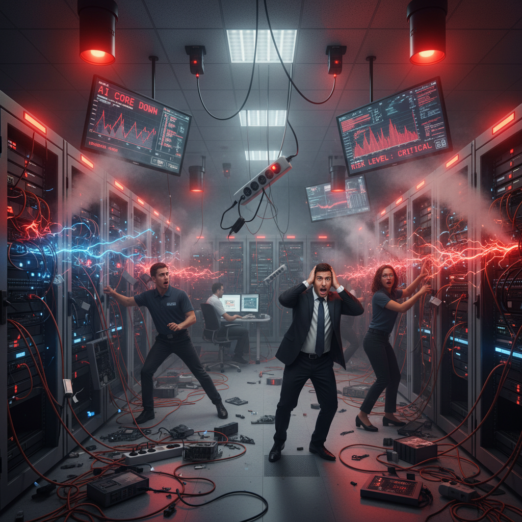 A chaotic server room with alarms and tangled cables, representing the fallout when AI decision making spins out of control.