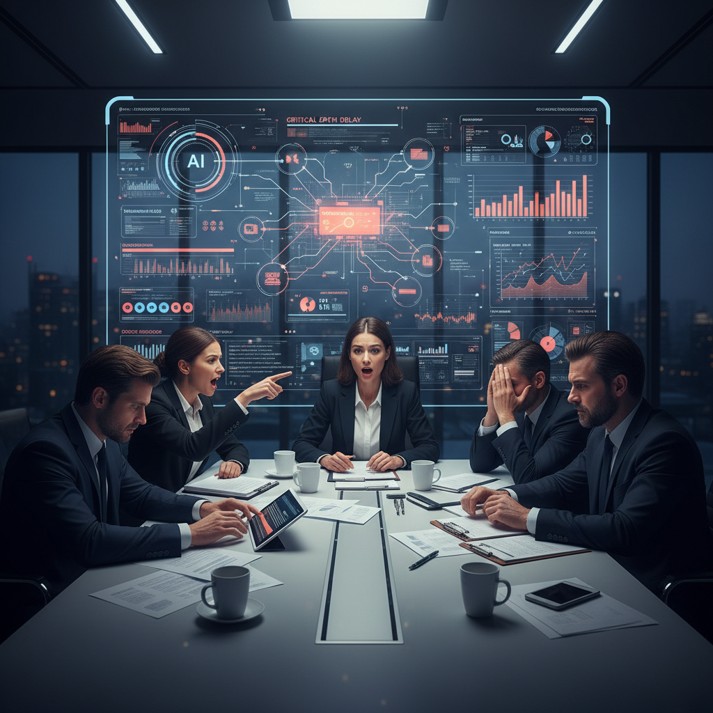 Alt: Team reviewing AI-driven project progress in a tense meeting with digital dashboards projected, faces reflecting relief and anxiety.