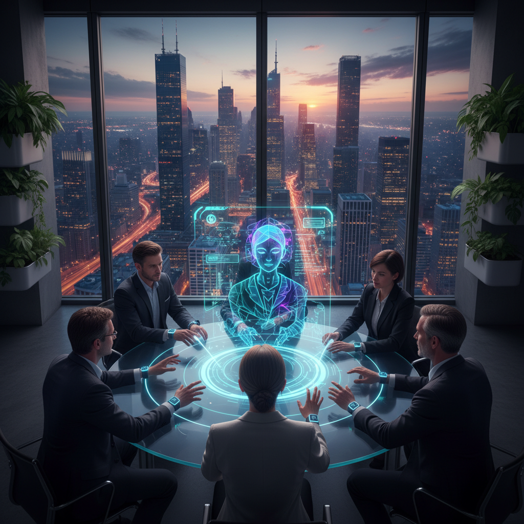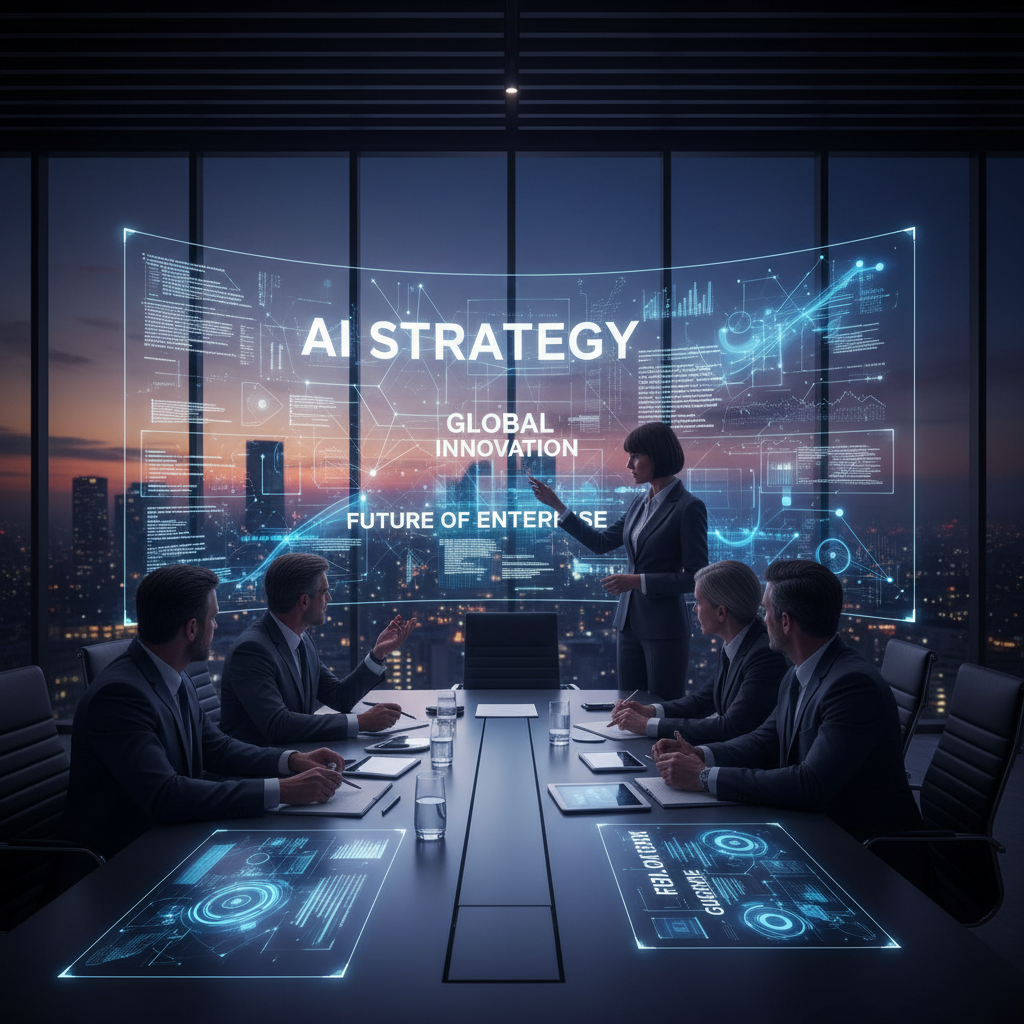 Alt text: Executives debating AI implementation in modern boardroom with digital projections, highlighting AI tools for enterprise management.