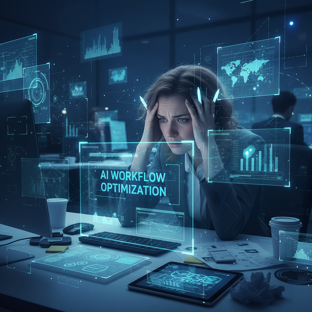 Alt text: Employee overwhelmed by complex AI workflow, highlighting the human cost of unmanaged AI deployment.