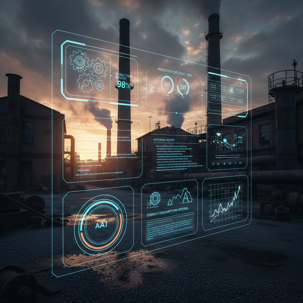 Alt text: AI dashboard projected over a traditional industry setting, illustrating the fusion of legacy processes and modern AI tools.