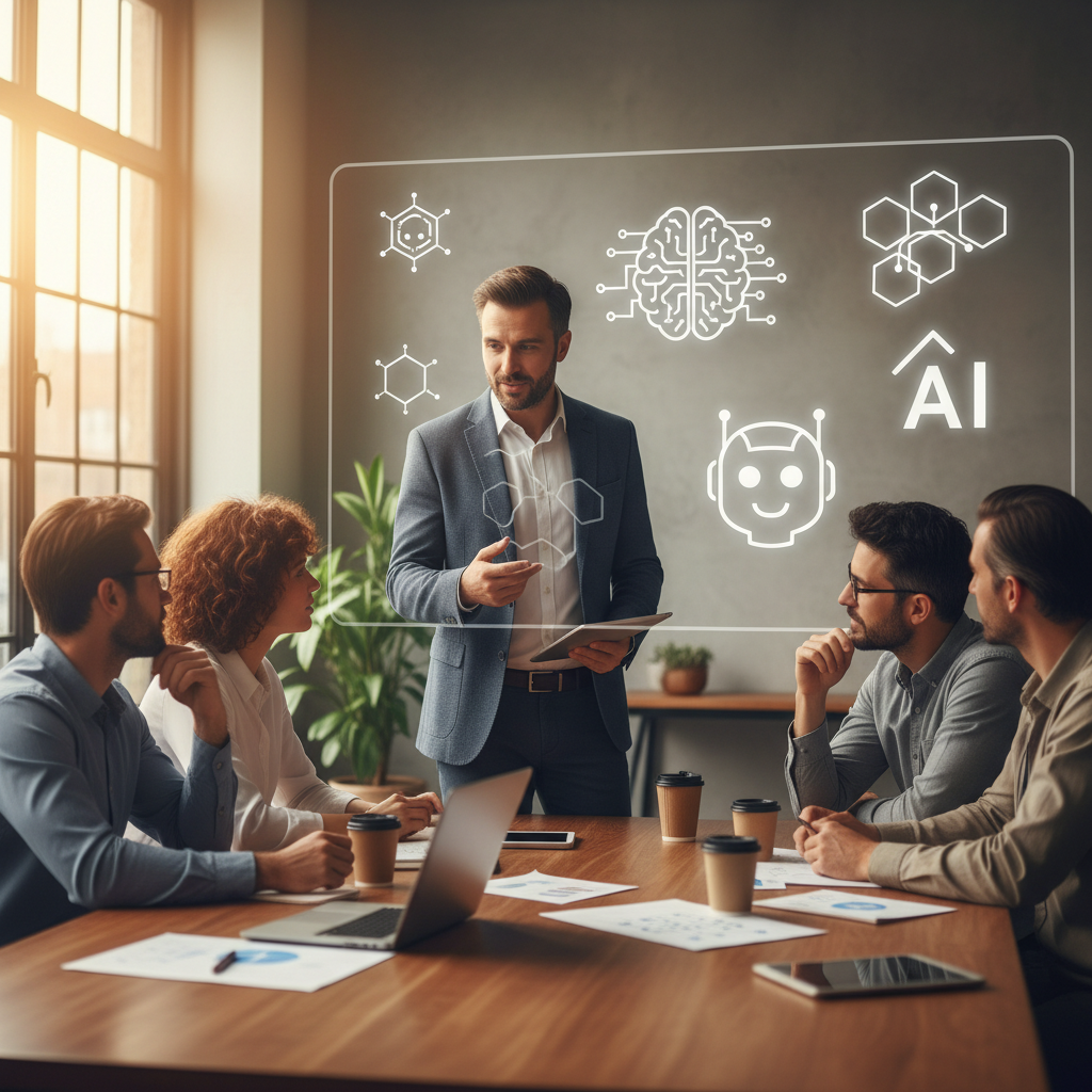 Alt text: Team collaborating with AI interface in modern office, demonstrating AI-powered collaboration and decision-making.