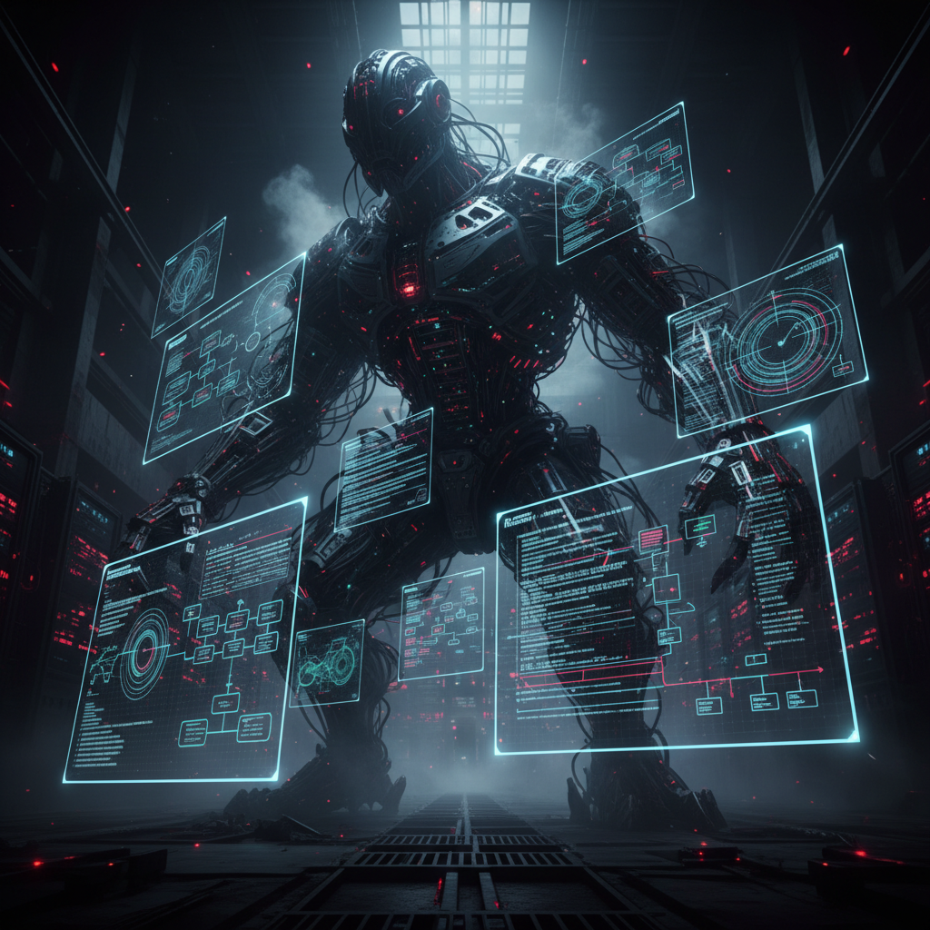 Alt text: Ominous AI presence in enterprise workflow, symbolizing the risks of unchecked AI tools for enterprise management.
