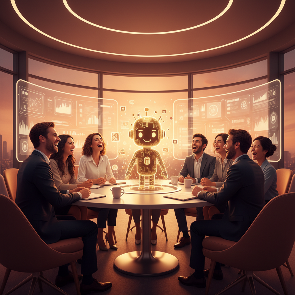 Alt text: Team collaborating positively with AI teammate, showing the human side of AI-powered enterprise management.