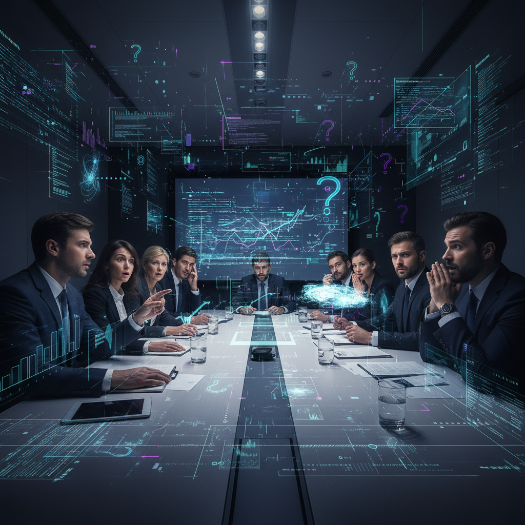 Business leaders struggling with analysis pitfalls, digital overlays of confusion in boardroom.