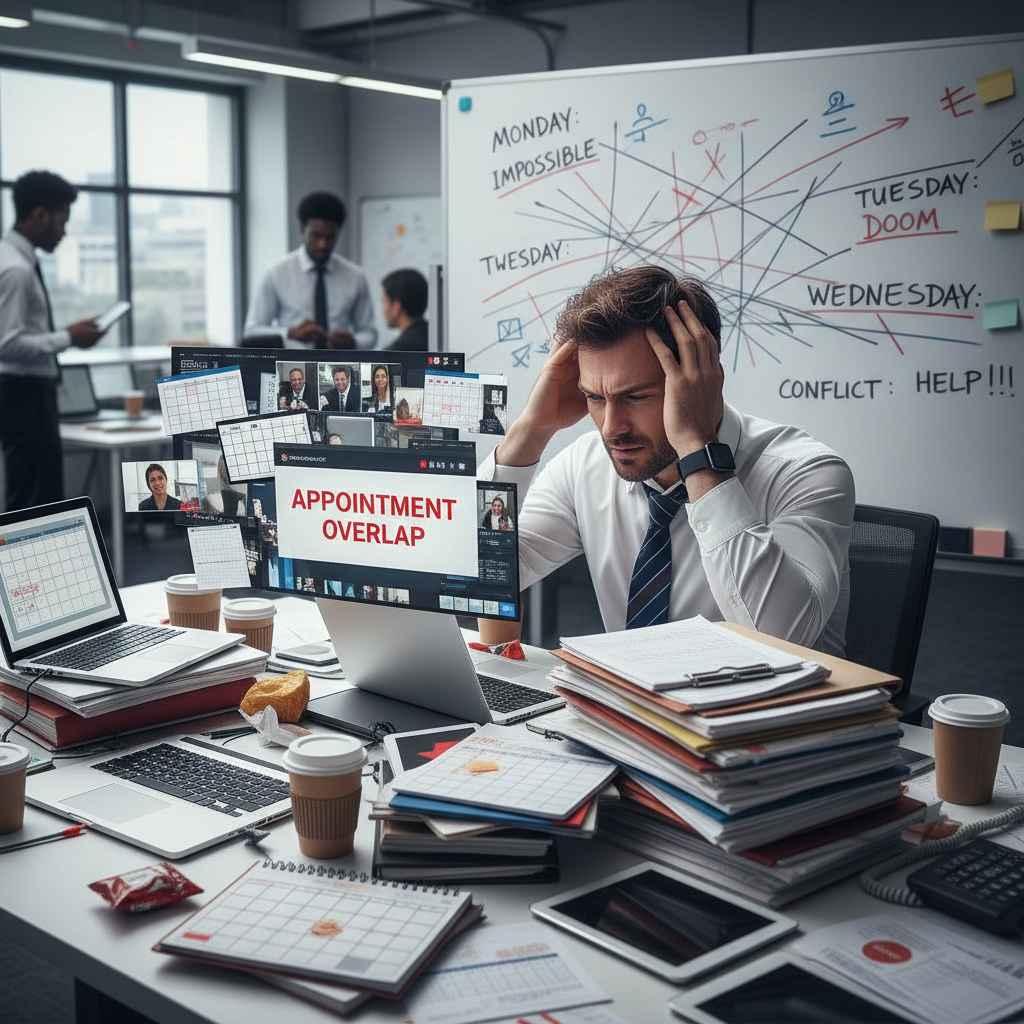 Alt: Executive overwhelmed by chaotic appointment scheduling in office, appointment arranger solution needed