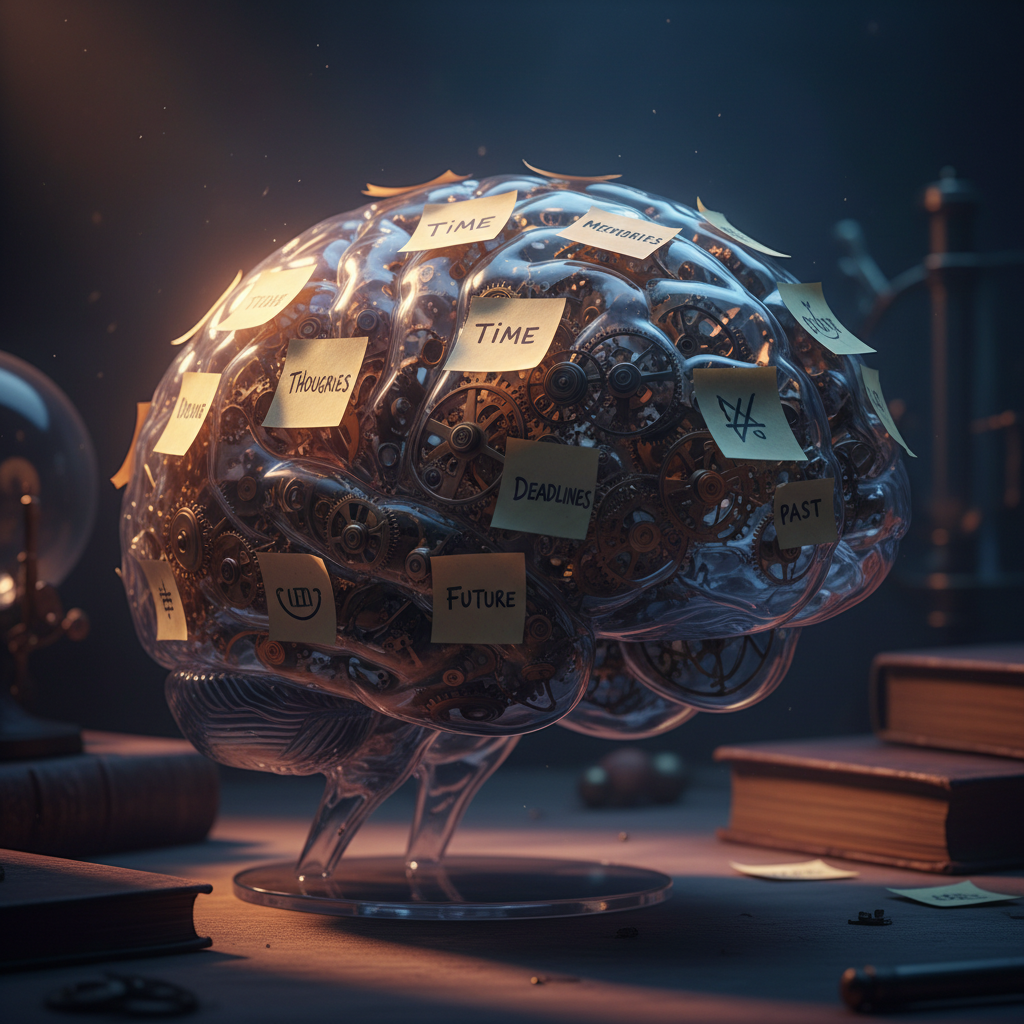 Alt text: Conceptual photo of a brain encircled by swirling clocks and sticky notes, illustrating appointment planning stress.