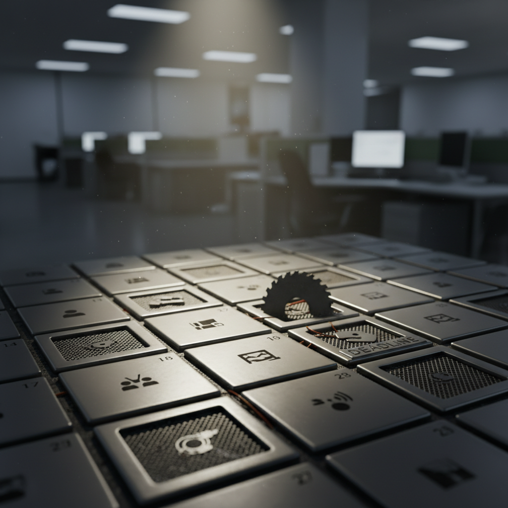 Alt text: Digital illustration of a calendar grid with hidden traps and illusions, symbolizing appointment planning chaos in a modern office.