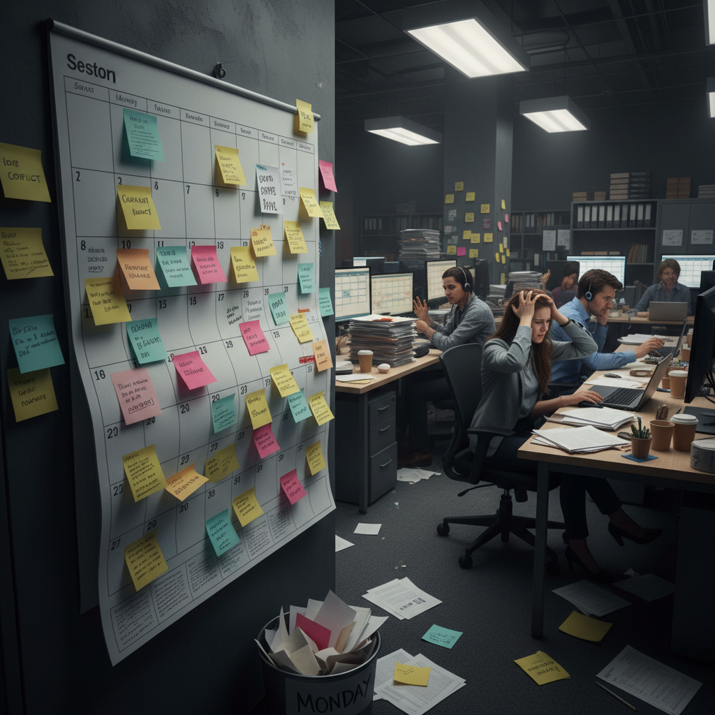 Alt text: Overbooked office calendar causing stress and chaos in enterprise settings with frantic employees contrasted by serene AI-managed workspace.