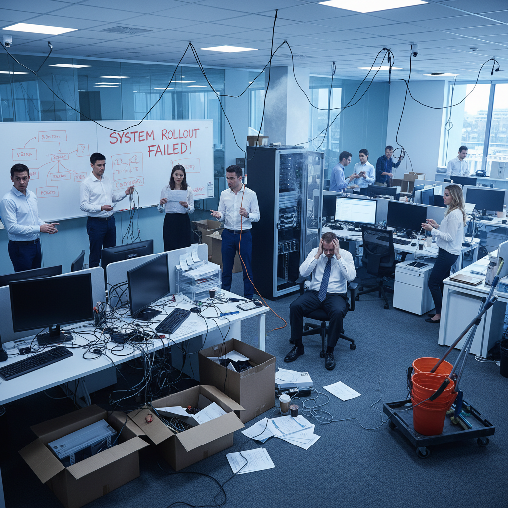 Alt text: Chaotic office scene with frustrated workers and empty desks after a failed as needed staff rollout.