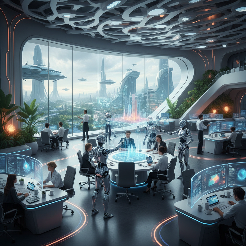Alt text: Futuristic office scene showing seamless collaboration between humans and AI teammates in a dynamic environment.