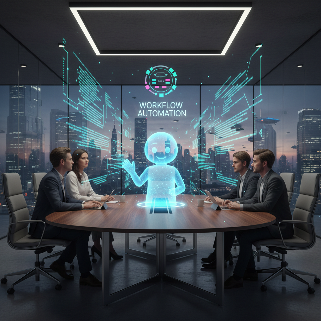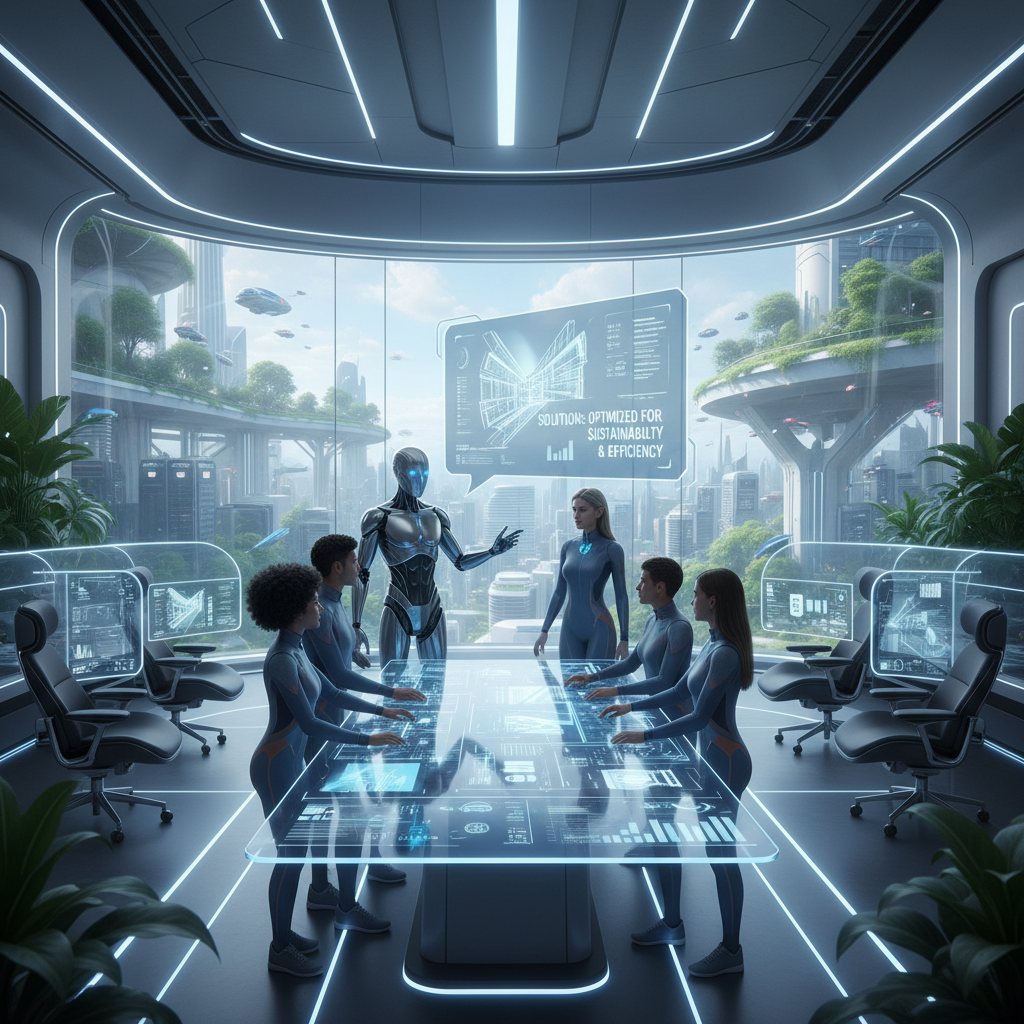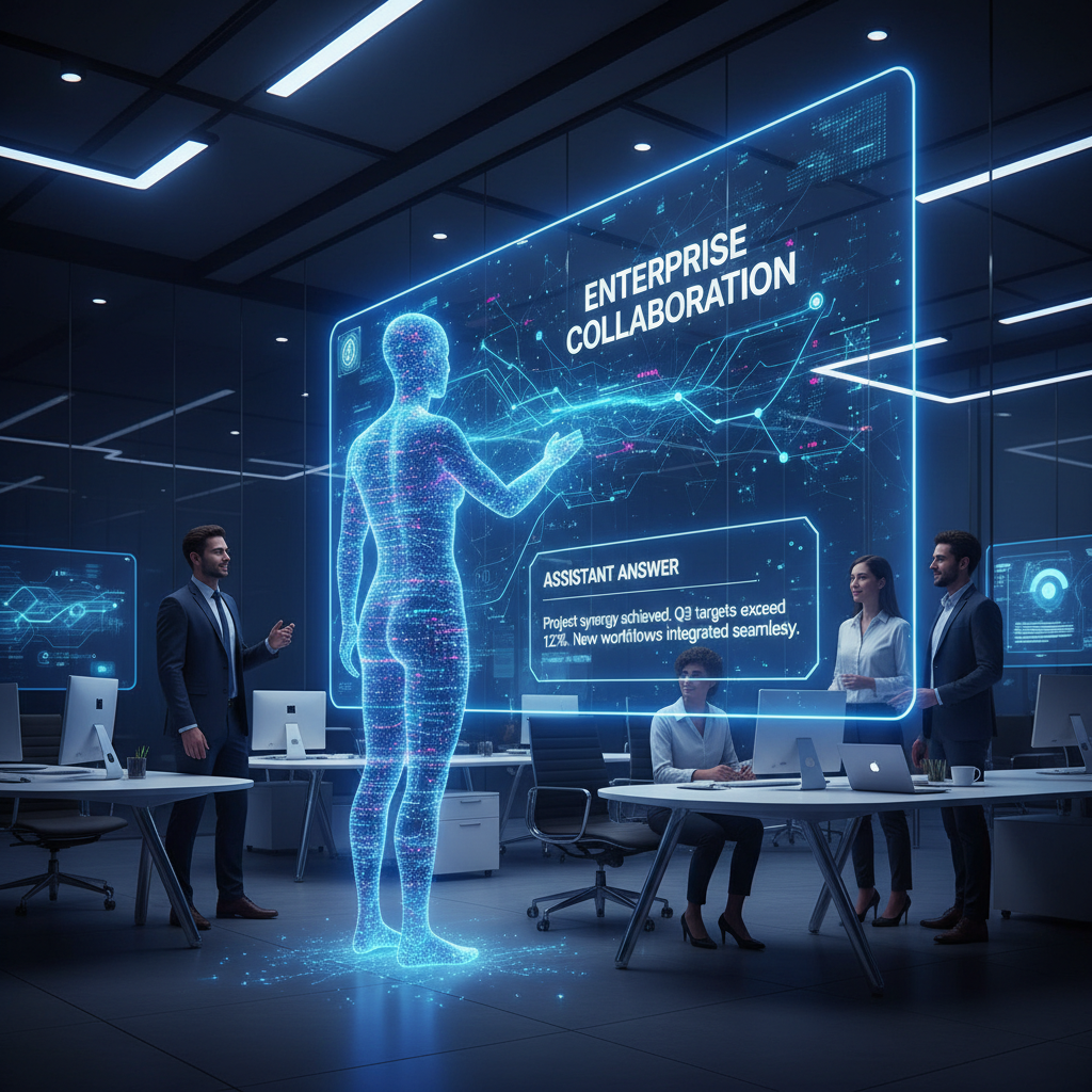 Image: Futuristic office with blended human-AI collaboration, vibrant lighting, showing the next stage of enterprise teamwork.