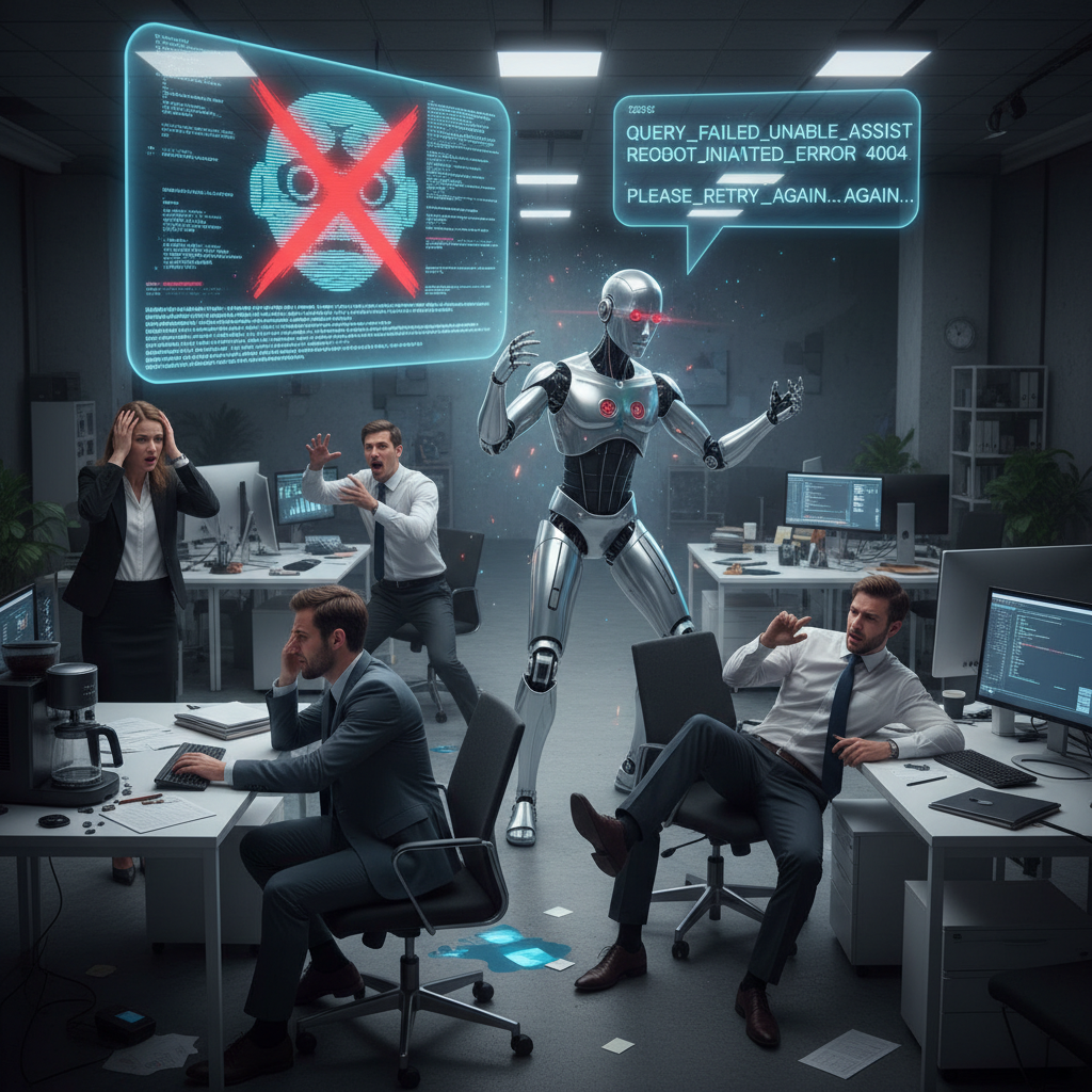 Image: Stark, moody office with a frustrated team, their faces lit by the harsh glow of a glitched AI interface—proof that technology, when poorly deployed, can sabotage more than it saves.