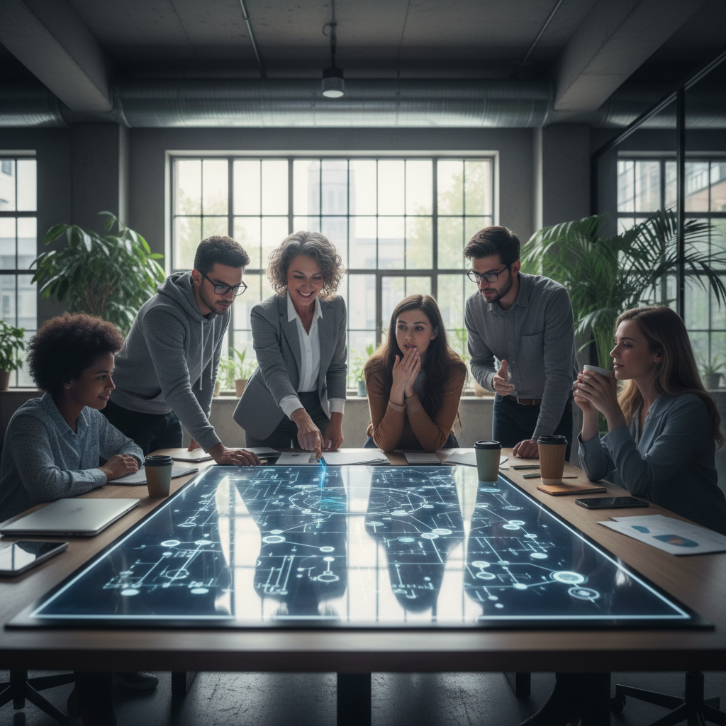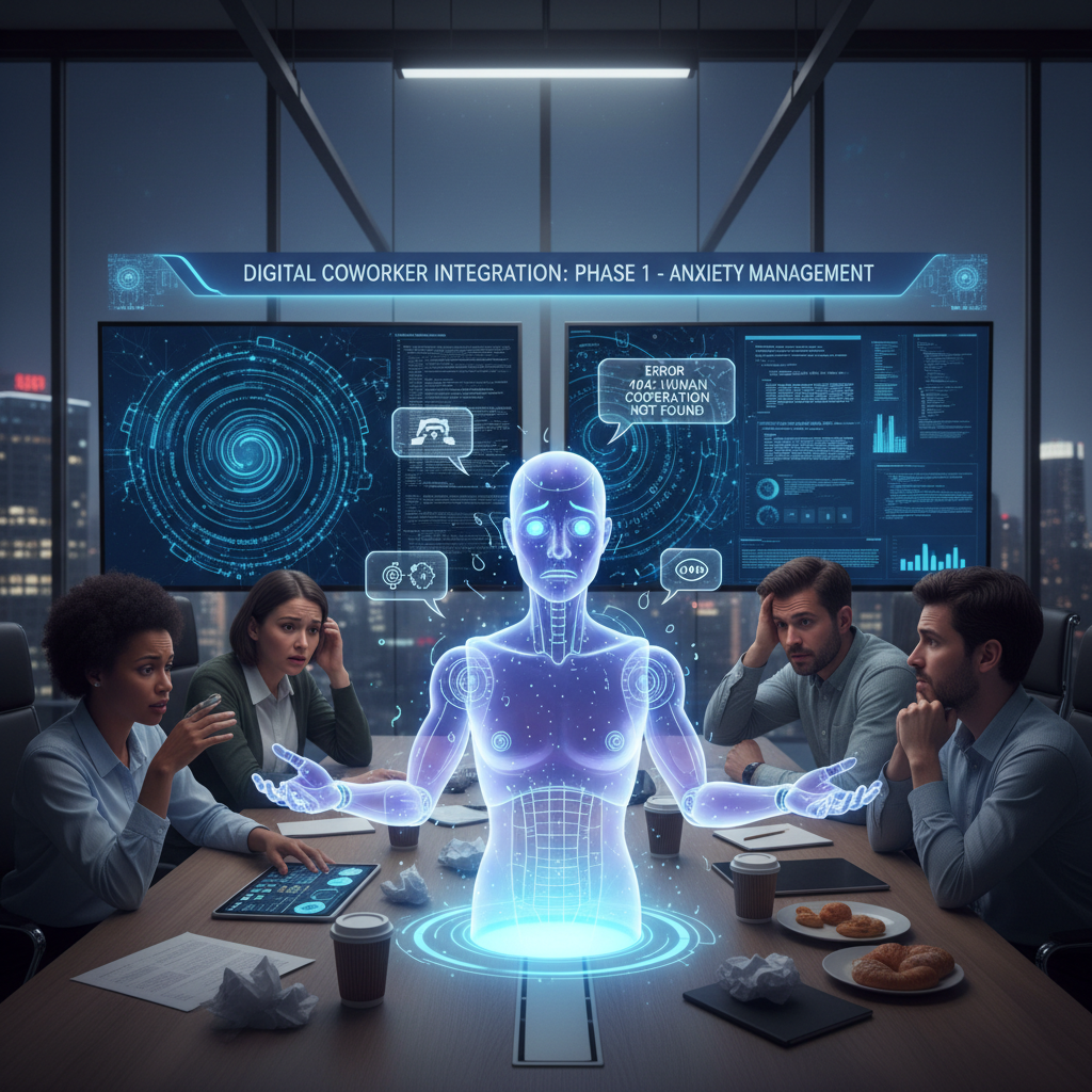 Image: Enterprise team working alongside an AI assistant worker, some visibly impressed, others skeptical or frustrated.