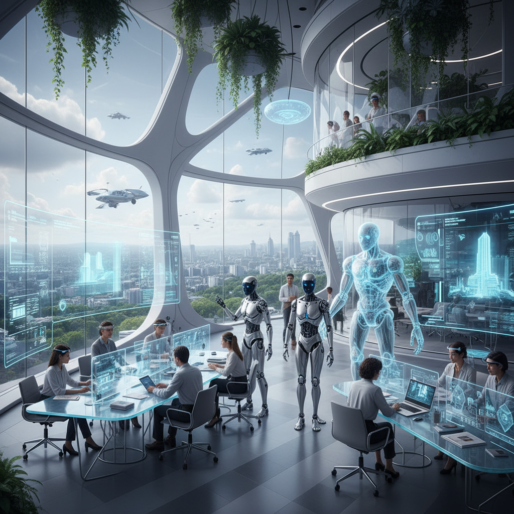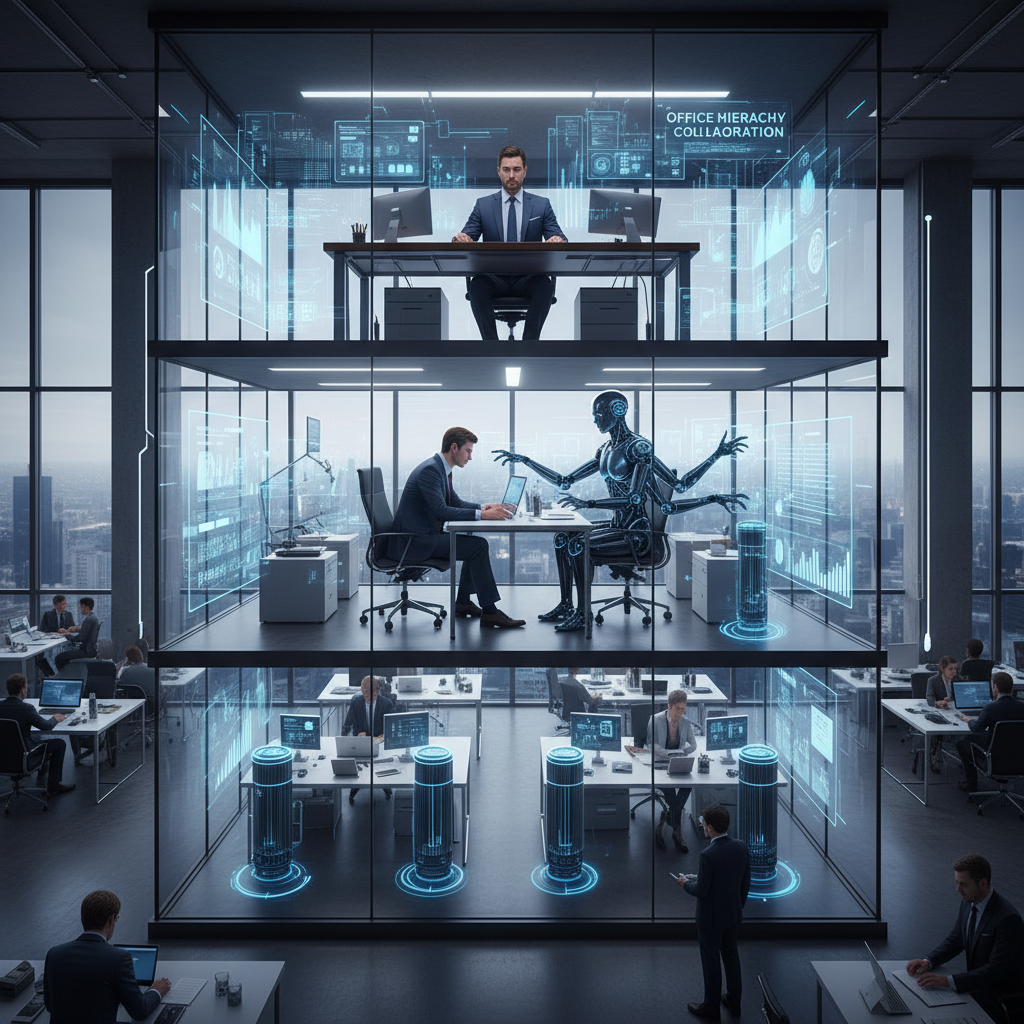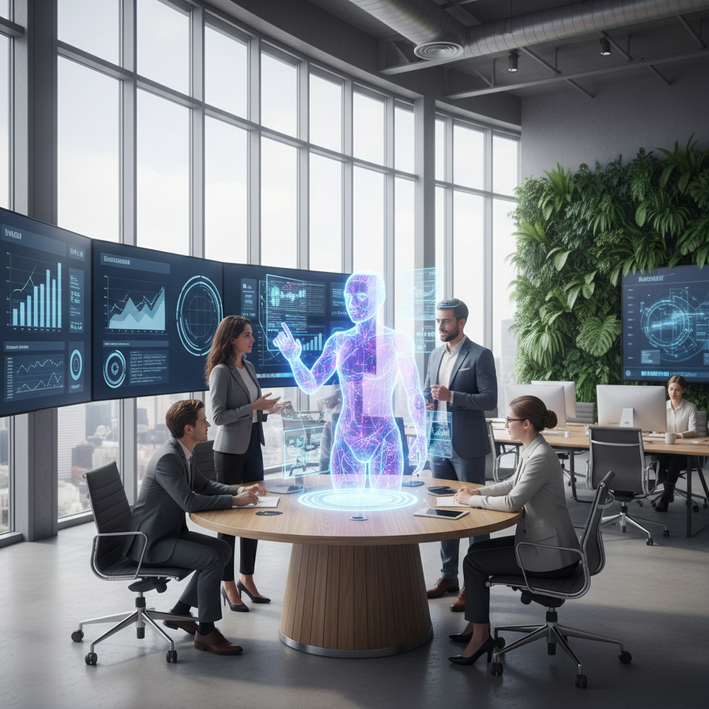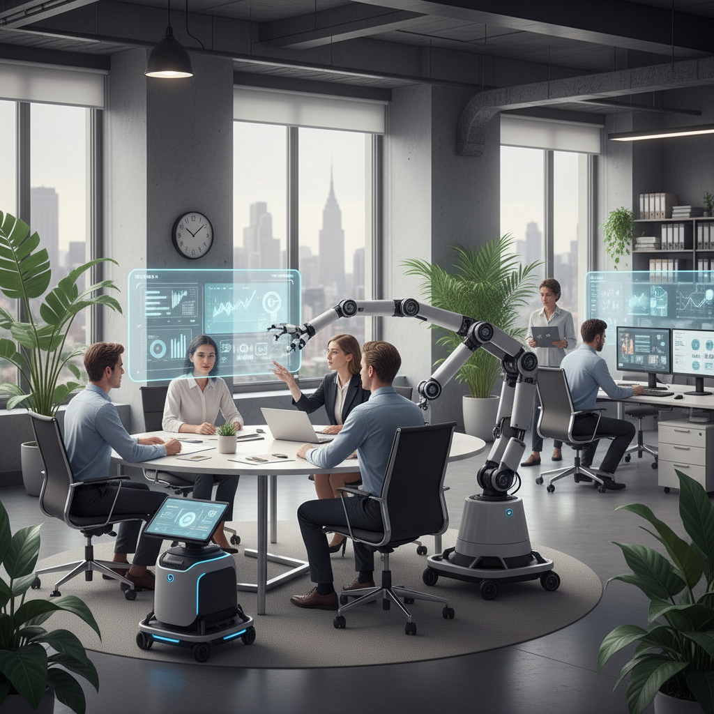 Image: Human team collaborating with digital co-bots in an office, reflecting the hybrid nature of modern teamwork.