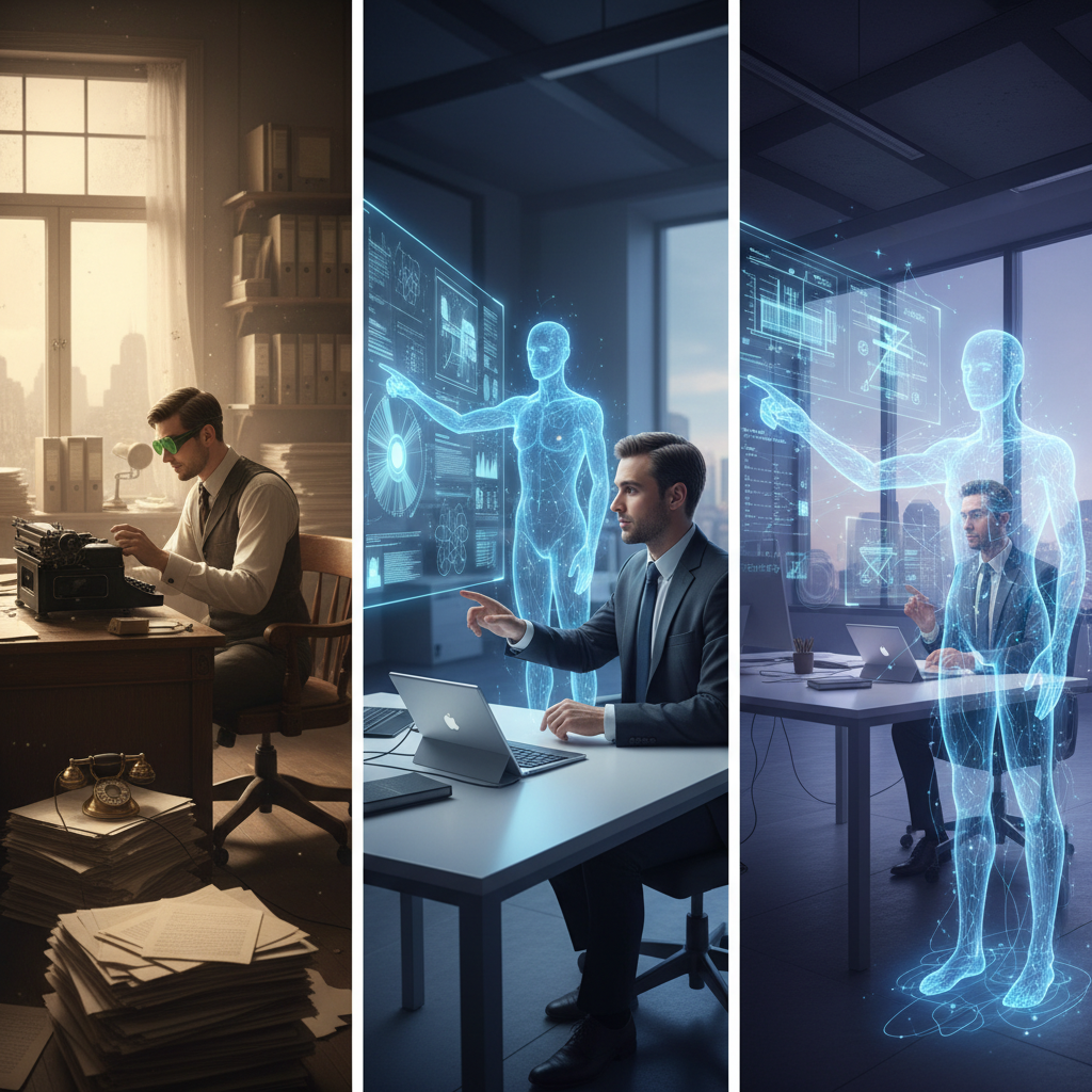 Image: Contrasting historic office assistants with today’s AI-powered digital coworkers, symbolizing the dramatic transformation in enterprise roles.